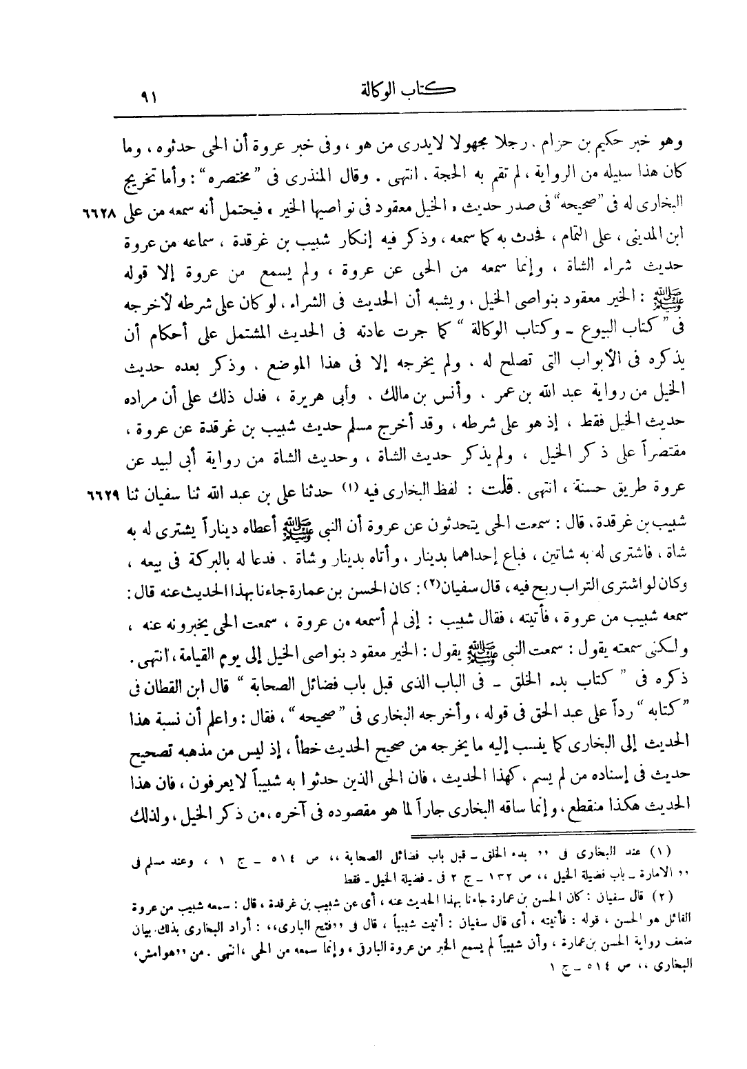 وَهُوَ خَبَرُ حَكِيمِ بْنِ حِزَامٍ، رَجُلًا مَجْهُولًا لَا يُدْرَى مَنْ هُوَ، وَفِي خَبَرِ عُرْوَةَ أَنَّ الْحَيَّ حَدَّثُوهُ، وَمَا كَانَ هَذَا سَبِيلَهُ مِنْ الرِّوَايَةِ، لَمْ تَقُمْ بِهِ الْحُجَّةُ، انْتَهَى. وَقَالَ الْمُنْذِرِيُّ فِي مُخْتَصَرِهِ: وَأَمَّا تَخْرِيجُ الْبُخَارِيِّ لَهُ فِي صَحِيحِهِ فِي صَدْرِ حَدِيثِ الْخَيْلُ مَعْقُودٌ فِي نَوَاصِيهَا الخير فيحتمل أنه سمع مِنْ عَلِيِّ بْنِ الْمَدِينِيِّ، عَلَى التَّمَامِ، فَحَدَّثَ بِهِ كَمَا سَمِعَهُ، وَذَكَرَ فِيهِ إنْكَارَ شَبِيبِ بْنِ غَرْقَدَةَ، سَمَاعَهُ مِنْ عُرْوَةَ حَدِيثَ شِرَاءِ الشَّاةِ، وَإِنَّمَا سَمِعَهُ مِنْ الْحَيِّ عَنْ عُرْوَةَ، وَلَمْ يَسْمَعْ عَنْ عُرْوَةَ إلَّا قَوْلَهُ صَلَّى اللَّهُ عَلَيْهِ وَسَلَّمَ: " الْخَيْرُ مَعْقُودٌ بِنَوَاصِي الْخَيْلِ"، وَيُشْبِهُ أَنَّ الْحَدِيثَ فِي الشِّرَاءِ، لَوْ كَانَ عَلَى شَرْطِهِ لَأَخْرَجَهُ فِي كِتَابِ الْبُيُوعِ وَكِتَابِ الْوَكَالَةِ كَمَا جَرَتْ عَادَتُهُ فِي الْحَدِيثِ الْمُشْتَمِلِ عَلَى أَحْكَامٍ أَنْ يَذْكُرَهُ فِي الْأَبْوَابِ الَّتِي تَصْلُحُ لَهُ، وَلَمْ يُخْرِجْهُ إلَّا فِي هَذَا الْمَوْضِعِ، وَذَكَرَ بَعْدَهُ حَدِيثَ الْخَيْلِ مِنْ رِوَايَةِ عَبْدِ اللَّهِ بْنِ عُمَرَ، وأنس بن مالك، وأبو هُرَيْرَةَ، فَدَلَّ ذَلِكَ عَلَى أَنَّ مُرَادَهُ حَدِيثُ الْخَيْلِ فَقَطْ، إذْ هُوَ عَلَى شَرْطِهِ، وَقَدْ أَخْرَجَ مُسْلِمٌ حَدِيثَ شَبِيبِ بْنِ غَرْقَدَةَ عَنْ عُرْوَةَ، مُقْتَصِرًا عَلَى ذِكْرِ الْخَيْلِ، وَلَمْ يَذْكُرْ حَدِيثَ الشَّاةِ، وَحَدِيثُ الشَّاةِ مِنْ رِوَايَةِ أَبِي لَبِيدٍ عَنْ عُرْوَةَ طَرِيقٌ حَسَنَةٌ، انْتَهَى. قُلْت: لَفْظُ الْبُخَارِيِّ فِيهِ1 حَدَّثَنَا عَلِيُّ بْنُ عَبْدِ اللَّهِ ثَنَا سُفْيَانُ ثَنَا شَبِيبُ بْنُ غَرْقَدَةَ، قَالَ: سَمِعْت الْحَيَّ يَتَحَدَّثُونَ عَنْ عُرْوَةَ أَنَّ النَّبِيَّ صَلَّى اللَّهُ عَلَيْهِ وَسَلَّمَ أَعْطَاهُ دِينَارًا يَشْتَرِي لَهُ بِهِ شَاةً، فَاشْتَرَى لَهُ بِهِ شَاتَيْنِ، فَبَاعَ إحْدَاهُمَا بِدِينَارٍ، وَأَتَاهُ بِدِينَارٍ وَشَاةٍ، فَدَعَا لَهُ بِالْبَرَكَةِ فِي بَيْعِهِ، وَكَانَ لَوْ اشْتَرَى التُّرَابَ رَبِحَ فِيهِ، قَالَ سُفْيَانُ2 لَوْ كَانَ الْحَسَنُ بْنُ عُمَارَةَ جَاءَ بِهَذَا الْحَدِيثِ عَنْهُ قَالَ: سَمِعَهُ شَبِيبٌ مِنْ عُرْوَةَ، فَأَتَيْتُهُ، فَقَالَ شَبِيبٌ: إنِّي لَمْ أَسْمَعْهُ مِنْ عُرْوَةَ، سَمِعْتُ الْحَيَّ يُخْبِرُونَهُ عَنْهُ، وَلَكِنِّي سَمِعْتُهُ يَقُولُ: سَمِعْتُ النَّبِيَّ صَلَّى اللَّهُ عَلَيْهِ وَسَلَّمَ يَقُولُ: "الْخَيْرُ مَعْقُودٌ بِنَوَاصِي الْخَيْلِ إلَى يَوْمِ الْقِيَامَةِ"، انْتَهَى. ذَكَرَهُ فِي كِتَابِ بَدْءِ الْخَلْقِ فِي الْبَابِ الَّذِي قَبْلَ بَابِ فَضَائِلِ الصَّحَابَةِ قَالَ ابْنُ الْقَطَّانِ فِي كِتَابِهِ رَدًّا عَلَى عَبْدِ الْحَقِّ فِي قَوْلِهِ، وَأَخْرَجَهُ الْبُخَارِيُّ فِي صَحِيحِهِ، فَقَالَ: وَاعْلَمْ أَنَّ نِسْبَةَ هَذَا الْحَدِيثِ إلَى الْبُخَارِيِّ كَمَا يُنْسَبُ إلَيْهِ مَا يُخَرِّجُهُ مِنْ صَحِيحِ الْحَدِيثِ خَطَأٌ، إذْ لَيْسَ مِنْ مَذْهَبِهِ تَصْحِيحُ حَدِيثٍ فِي إسْنَادِهِ مَنْ لَمْ يُسَمَّ، كَهَذَا الْحَدِيثِ، فَإِنَّ الْحَيَّ الَّذِينَ حَدَّثُوا بِهِ شَبِيبًا لَا يُعْرَفُونَ، فَإِنَّ هَذَا الْحَدِيثَ هَكَذَا مُنْقَطِعٌ، وَإِنَّمَا سَاقَهُ الْبُخَارِيُّ جَارًا لِمَا هُوَ مَقْصُودُهُ فِي آخِرِهِ، مِنْ ذِكْرِ الْخَيْلِ، وَلِذَلِكَ