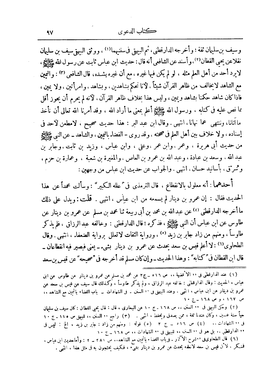 6 قال الطحاوي في شرح الآثار في باب القضاء باليمين مع الشاهد ص 281 ج 2: وأما حديث ابن عباس، فمنكر، لأن قيس بن سعد لا نعلمه يحدث عن عمرو بن دينار بشيء، فكيف يحتجون به في مثل هذا، انتهى.