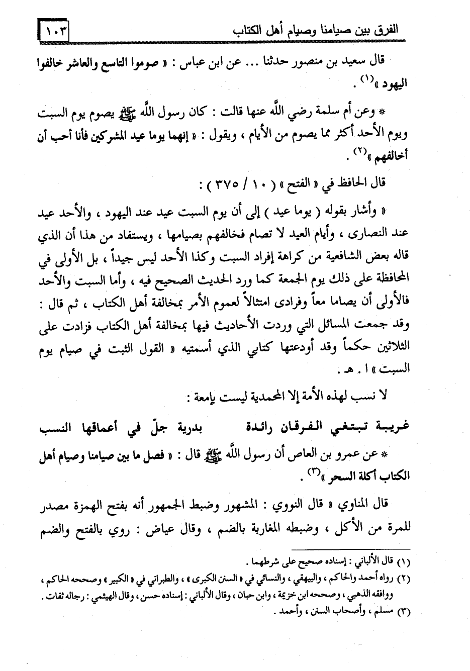 "وأشار بقوله (يوماً عيد) إلى أن يوم السبت عيد عند اليهود، والأحد عيد عند النصارى، وأيام العيد لا تصام فخالفهم بصيامها، ويستفاد من هذا أن الذي قاله بعض الشافعية من كراهة إفراد السبت وكذا الأحد ليس جيداً، بل الأولى في المحافظة على ذلك يوم الجمعة كما ورد الحديث الصحيح فيه، وأما السبت والأحد فالأولى أن يصاما معاً وفرادى امتثالاً لعموم الأمر بمخالفة أهل الكتاب، ثم قال: وقد جمعت المسائل التي وردت الأحاديث فيها بمخالفة أهل الكتاب فزادت على الثلاثين حكماً وقد أودعتها كتابي الذي أسمتيه "القول الثبت في صيام يوم السبت" ا. هـ.