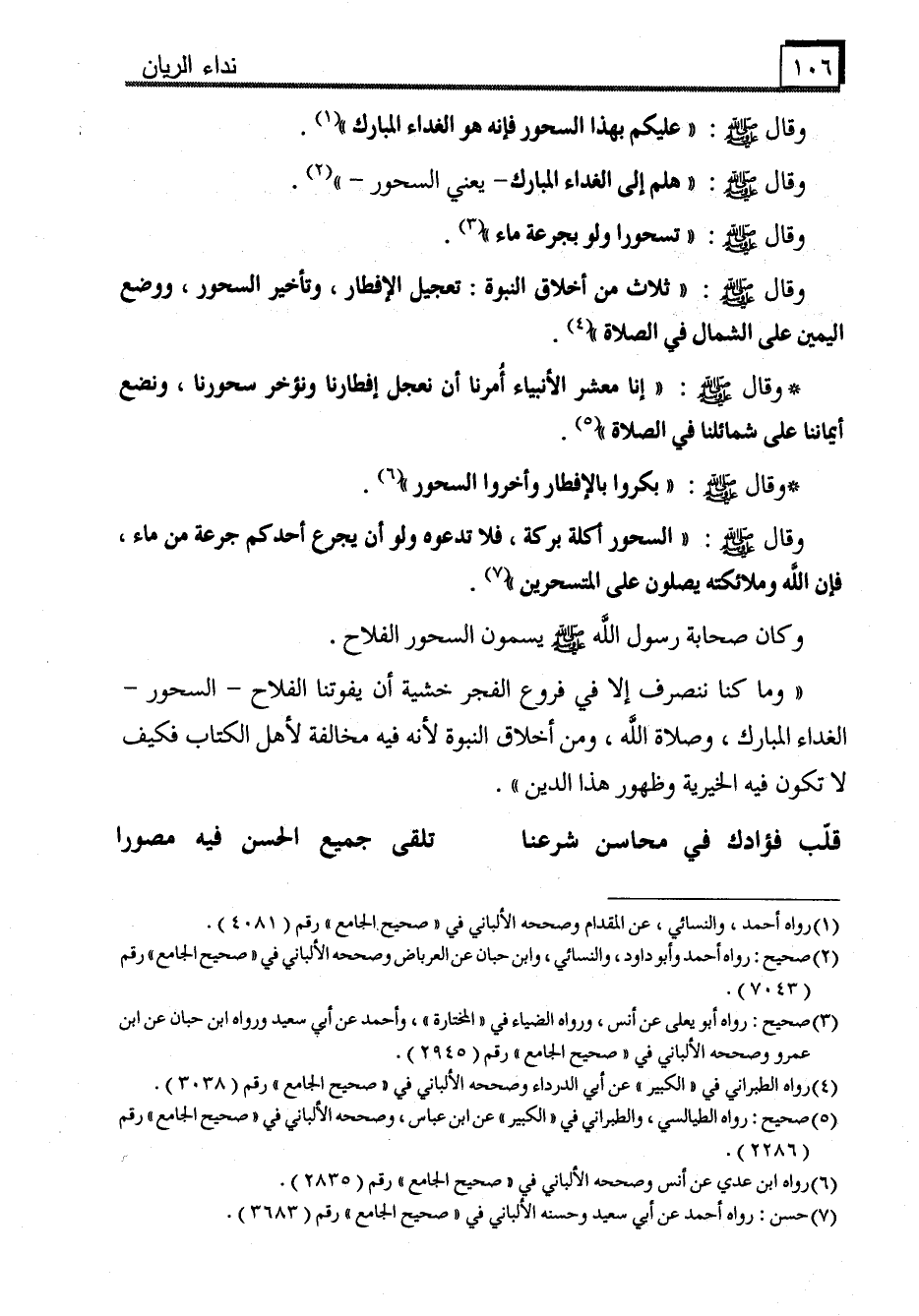"وما كنا ننصرف إلا في فروع الفجر خشيهّ أن يفوتنا الفلاح -السحور- الغداء المبارك، وصلاة الله، ومن أخلاق النبوة لأنه فيه مخالفة لأهل الكتاب فكيف لا تكون فيه الخيرية وظهور هذا الدين".