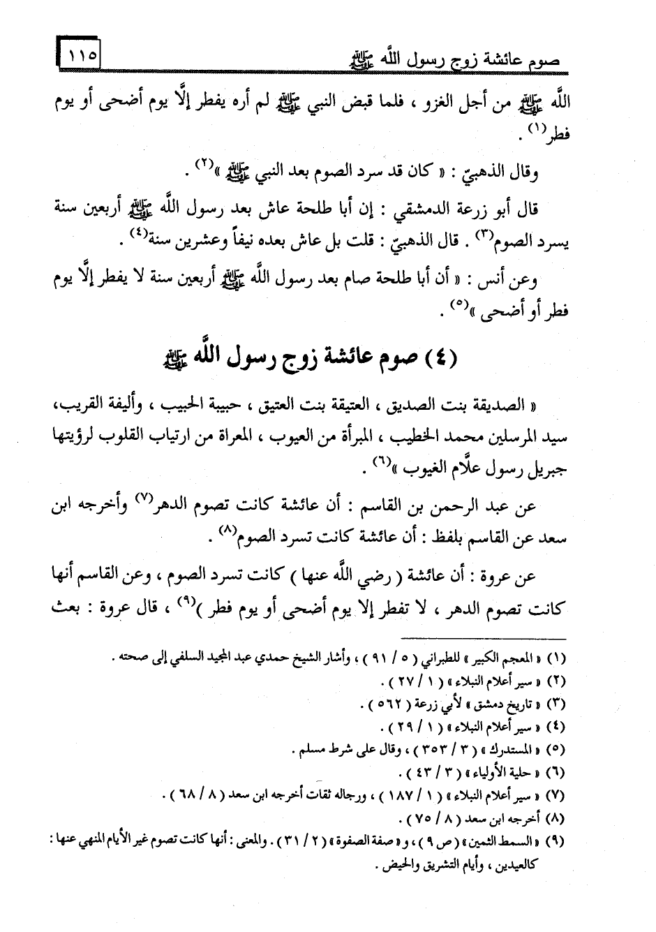 (9) "السمط الثمين" (ص 9) ، و"صفة الصفوة" (2/31) . والمعنى: أنها كانت تصوم غير الأيام المنهي عنها: كالعيدين، وأيام التشريق والحيض.