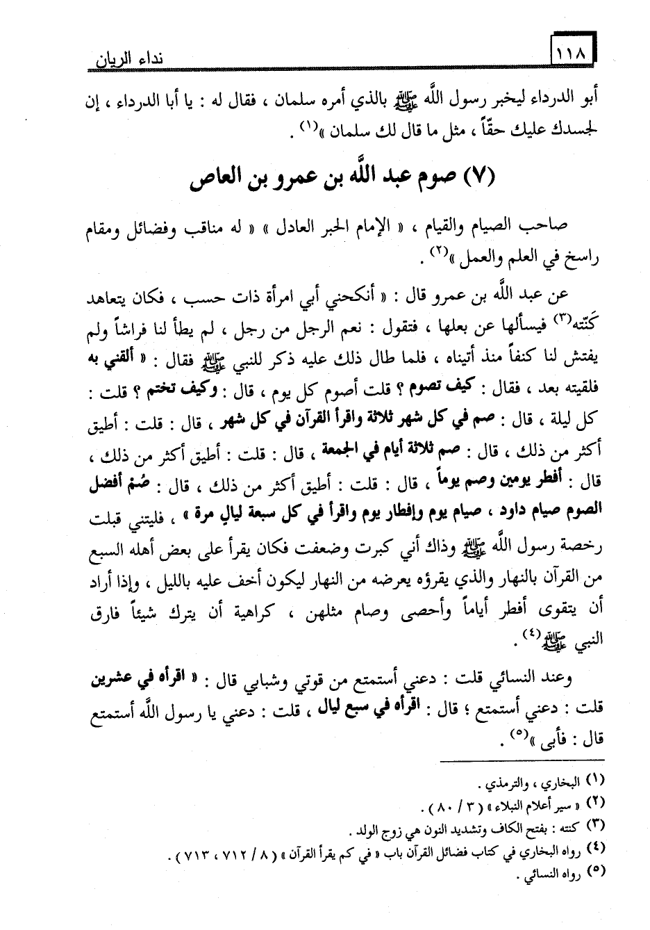 عن عبد الله بن عمرو قال: "أنكحنى أبي امرأة ذات حسب، فكان يتعاهد كنته (3) فيسألها عن بعلها، فتقول: نعم الرجل من رجل، لم يطأ لنا فراشاً ولم يفتش لنا كنفاً منذ أتيناه، فلما طال ذلك عليه ذكر للنبي - صَلَّى اللَّهُ عَلَيْهِ وَسَلَّمَ - فقال: "ألقنى به فلقيته بعد، فقال: كيف تصوم؟ قلت أصوم كل يوم، قال: وكيف تختم؟ قلت: كل ليلة، قال: صم في كل شهر ثلاثة واقرأ القرآن في كل شهر، قال: قلت: أطيق أكثر من ذلك، قال: صم ثلاثة أيام في الجمعة، قال: قلت: أطيق أكثر من ذلك، قال: أفطر يومين وصم يوماً، قال قلت: أطيق أكثر من ذلك، قال: صمْ أفضل الصوم صيام داود، صيام يوم وإفطار يوم واقرأ في كل سبعة ليالي مرة"، فليتني قبلت رخصة رسول الله - صَلَّى اللَّهُ عَلَيْهِ وَسَلَّمَ - وذاك أني كبرت وضعفت فكان يقرأ على بعض أهله السبع من القرآن بالنهار والذي يقرؤه يعرضه من النهار ليكون أخف عليه بالليل، وإذا أراد أن يتقوى أفطر أياماً وأحصى وصام مثلهن، كراهية أن يترك شيئاً فارق النبى - صَلَّى اللَّهُ عَلَيْهِ وَسَلَّمَ - (4) .