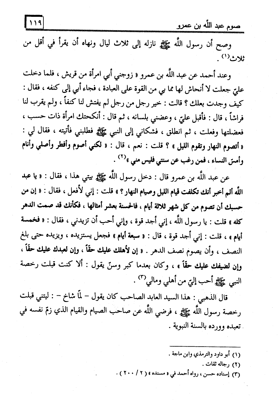 وصح أن رسول الله - صَلَّى اللَّهُ عَلَيْهِ وَسَلَّمَ - نازله إلى ثلاث ليال ونهاه أن يقرأ في أقل من ثلاث (1) .
