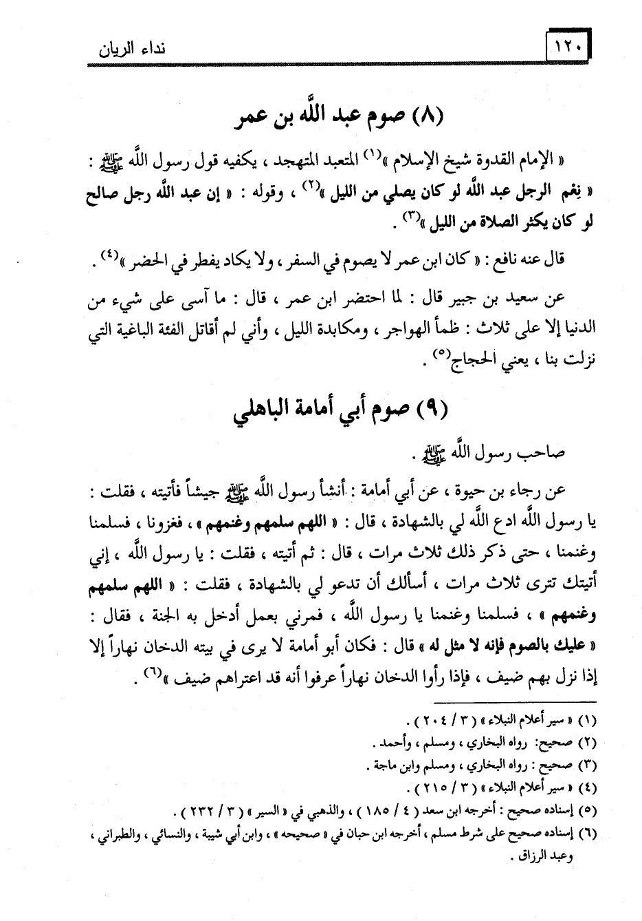 عن رجاء بن حيوة، عن أبي أمامة: أنشأ رسول الله - صَلَّى اللَّهُ عَلَيْهِ وَسَلَّمَ - جيشا فأتيته، فقلت: يا رسول الله ادع الله لي بالشهادة، قال: "اللهم سلمهم وغنمهم"، فغزونا، فسلمنا وغنمنا، حتى ذكر ذلك ثلاث مرات، قال: ثم أتيته، فقلت: يا رسول الله، إني أتيتك تترى ثلاث مرات، أسألك أن تدعو لي بالشهادة، فقلت: "اللهم سلمهم وغنمهم"، فسلمنا وغنمنا يا رسول الله، فمرني بعمل أدخل به الجنة، فقال: "عليك بالصوم فإنه لا مثل له" قال: فكان أبو أمامة لا يرى في بيته الدخان نهاراً إلا إذا نزل بهم ضيف، فإذا رأوا الدخان نهاراً عرفوا أنه قد اعتراهم ضيف" (6) .