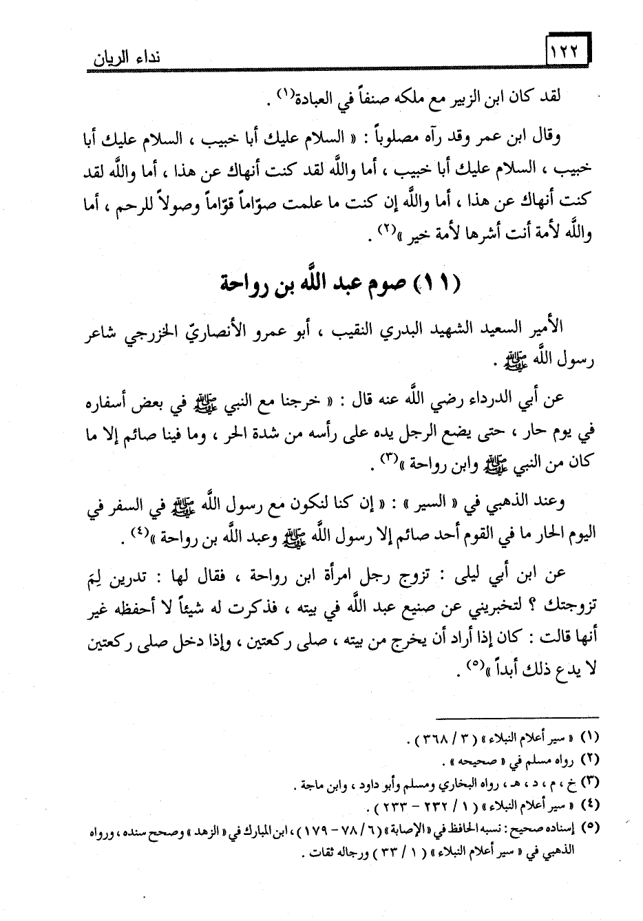 وعند الذهبي في "السير": "إن كنا لنكون مع رسول الله - صَلَّى اللَّهُ عَلَيْهِ وَسَلَّمَ - فى السفر في اليوم الحار ما في القوم أحد صائم إلا رسول الله - صَلَّى اللَّهُ عَلَيْهِ وَسَلَّمَ - وعبد الله بن رواحة" (4) .