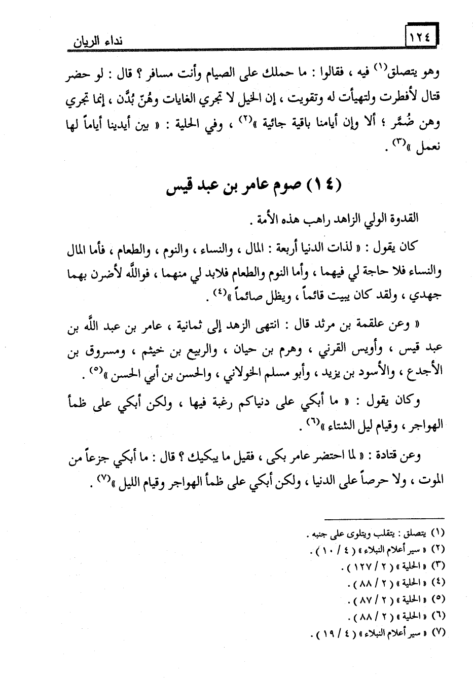 وعن قتادة: "لما احتضر عامر بكى، فقيل ما يبكيك؟ قال: ما أبكي جزعاً من الموت، ولا حرصاً على الدنيا، ولكن أبكي على ظمأ الهواجر وقيام الليل" (7) .
