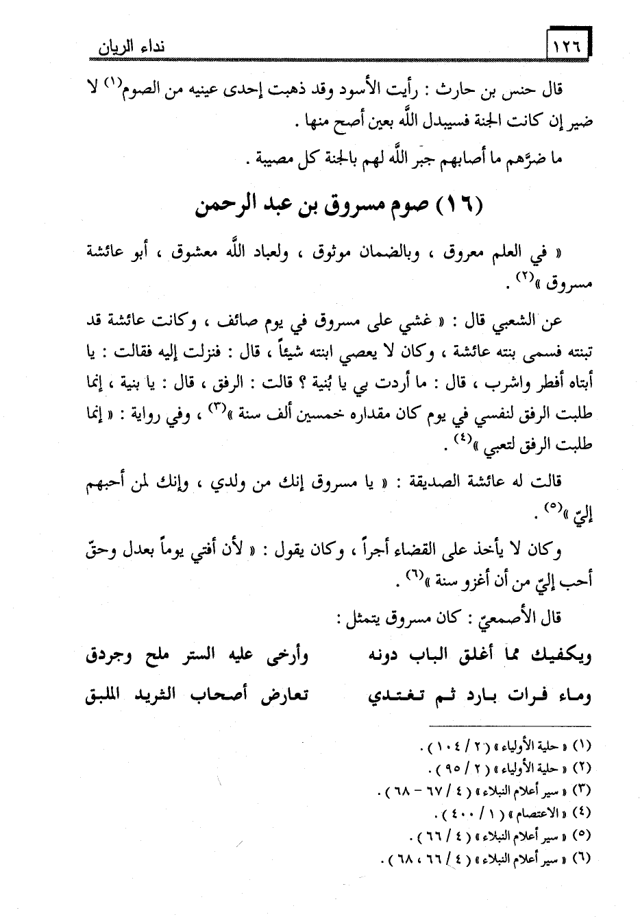 عن الشعبي قال: "غشي على مسروق في يوم صائف، وكانت عائشة قد تبنته فسمى بنته عائشة، وكان لا يعصي ابنته شيئاً، قال: فنزلت إليه فقالت: يا أبتاه أفطر واشرب، قال: ما أردت لي يا بُنية؟ قالت: الرفق، قال. يا بنية، إنما طلبت الرفق لنفسي في يوم كان مقداره خمسين إلى سنة" (3) ، وفي رواية: "إنما طلبت الرفق لتعبي" (4) .