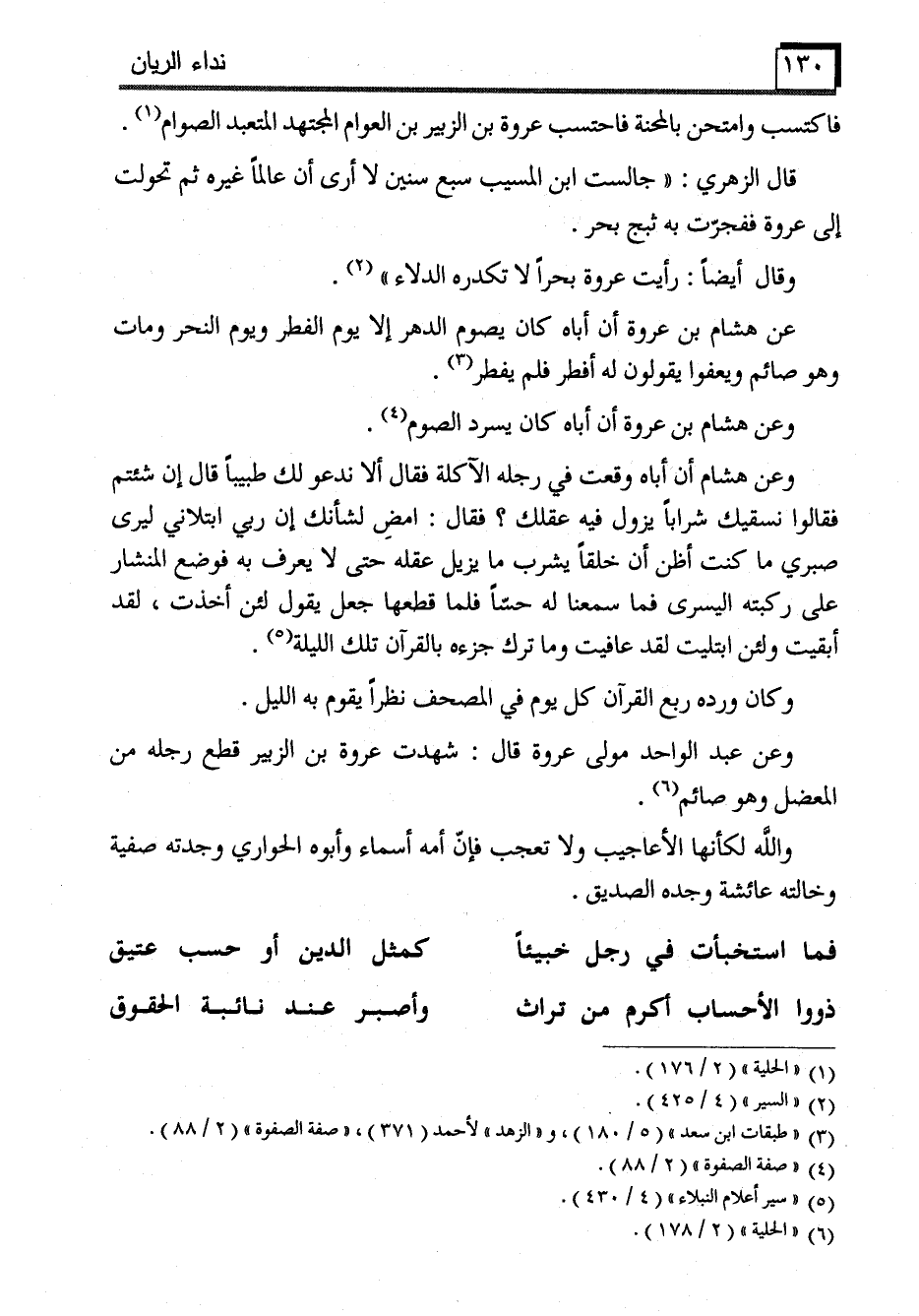 فاكتسب وامتحن بالمحنة فاحتسب عروة بن الزبير بن العوام المجتهد المتعبد الصوام (1) .