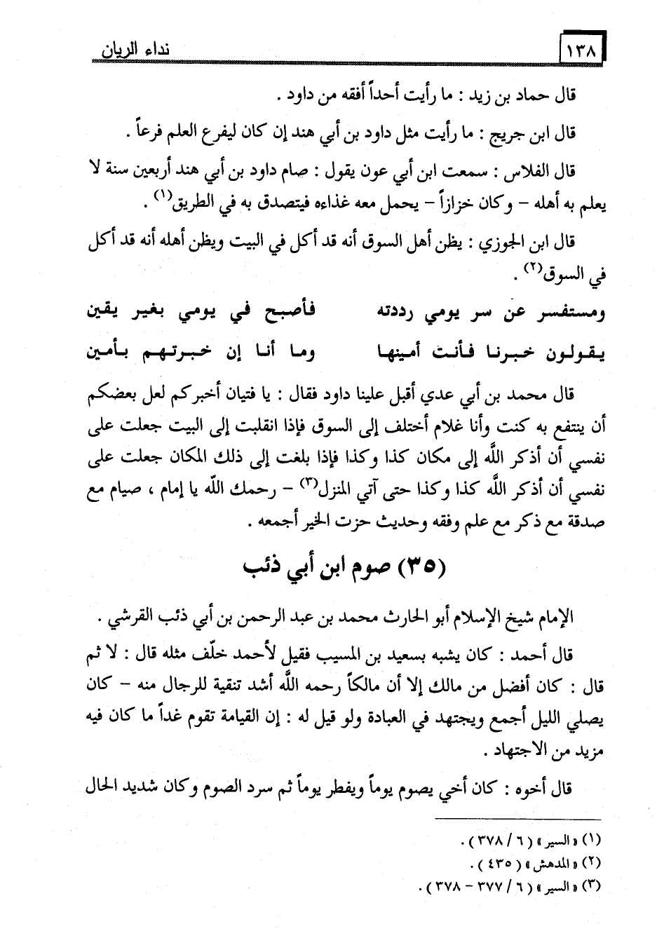 قال محمد بن أبي عدي أقبل علينا داود فقال: يا فتيان أخبركم لعل بعضكم أن ينتفع به كنت وأنا غلام أختلف إلى السوق فإذا انقلبت إلى البيت جعلت على نفسي أن أذكر الله إلى مكان كذا وكذا فإذا بلغت إلى ذلك المكان جعلت على نفسي أن أذكر الله كذا وكذا حتى آتي المنزل (3) - رحمك الله يا إمام، صيام مع صدقة مع ذكر مع علم وفقه وحديث حزت الخير أجمعه.