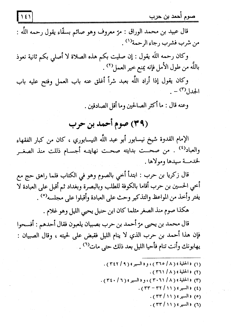قال محمد بن يحيى مرّ أحمد بن حرب بصبيان يلعبون فقال أحدهم: أفسحوا فإن هذا أحمد بن حرب الذي لا ينام الليل فقبض على لحيته، وقال الصبيان: يهابونك وأنت تنام فأحيا الليل بعد ذلك حتى مات (6) .