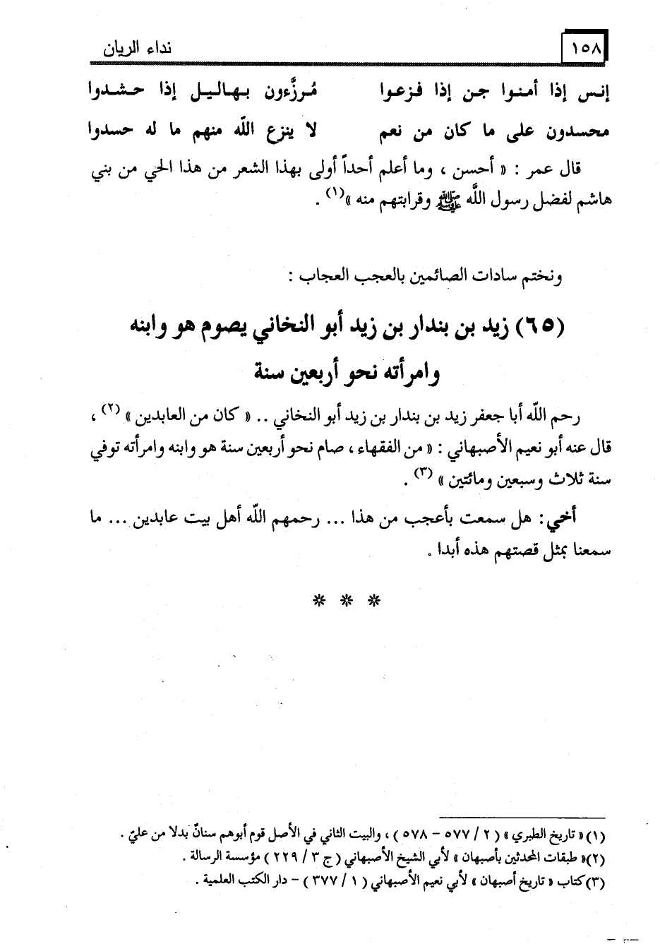 رحم الله أبا جعفر زيد بن بندار بن زيد أبو النخاني.. "كان من العابدين" (2) ، قال عنه أبو نعيم الأصبهاني: "من الفقهاء، صام نحو أربعين سنة هو وابنه وامرأته توفي سنة ثلاث وسبعين ومائتين" (3) .