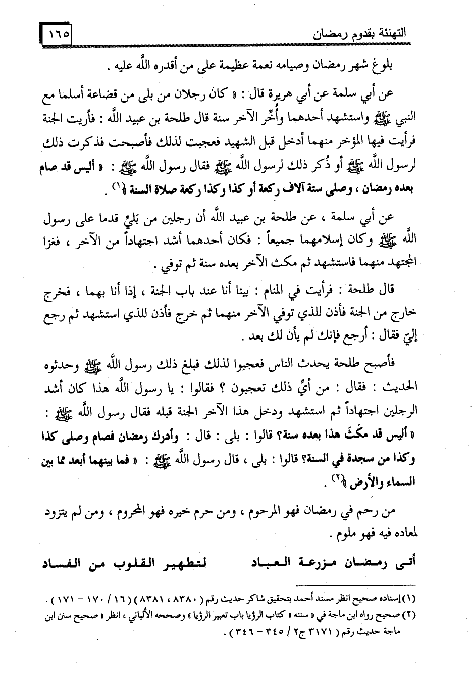 عن أبي سلمة عن أبي هريرة قال: "كان رجلان من بلى من قضاعة أسلما مع النبي - صَلَّى اللَّهُ عَلَيْهِ وَسَلَّمَ - واستشهد أحدهما وأُخِّر الآخر سنة قال طلحة بن عبيد الله: فأريت الجنة فرأيت فيها المؤخر منهما أدخل قبل الشهيد فعجبت لذلك فأصبحت فذكرت ذلك لرسول الله - صَلَّى اللَّهُ عَلَيْهِ وَسَلَّمَ - أو ذُكر ذلك لرسول الله - صَلَّى اللَّهُ عَلَيْهِ وَسَلَّمَ - فقال رسول الله - صَلَّى اللَّهُ عَلَيْهِ وَسَلَّمَ -: "أليس قد صام بعده رمضان، وصلى ستة آلاف ركعة أو كذا وكذا ركعة صلاة السنة" (1) .