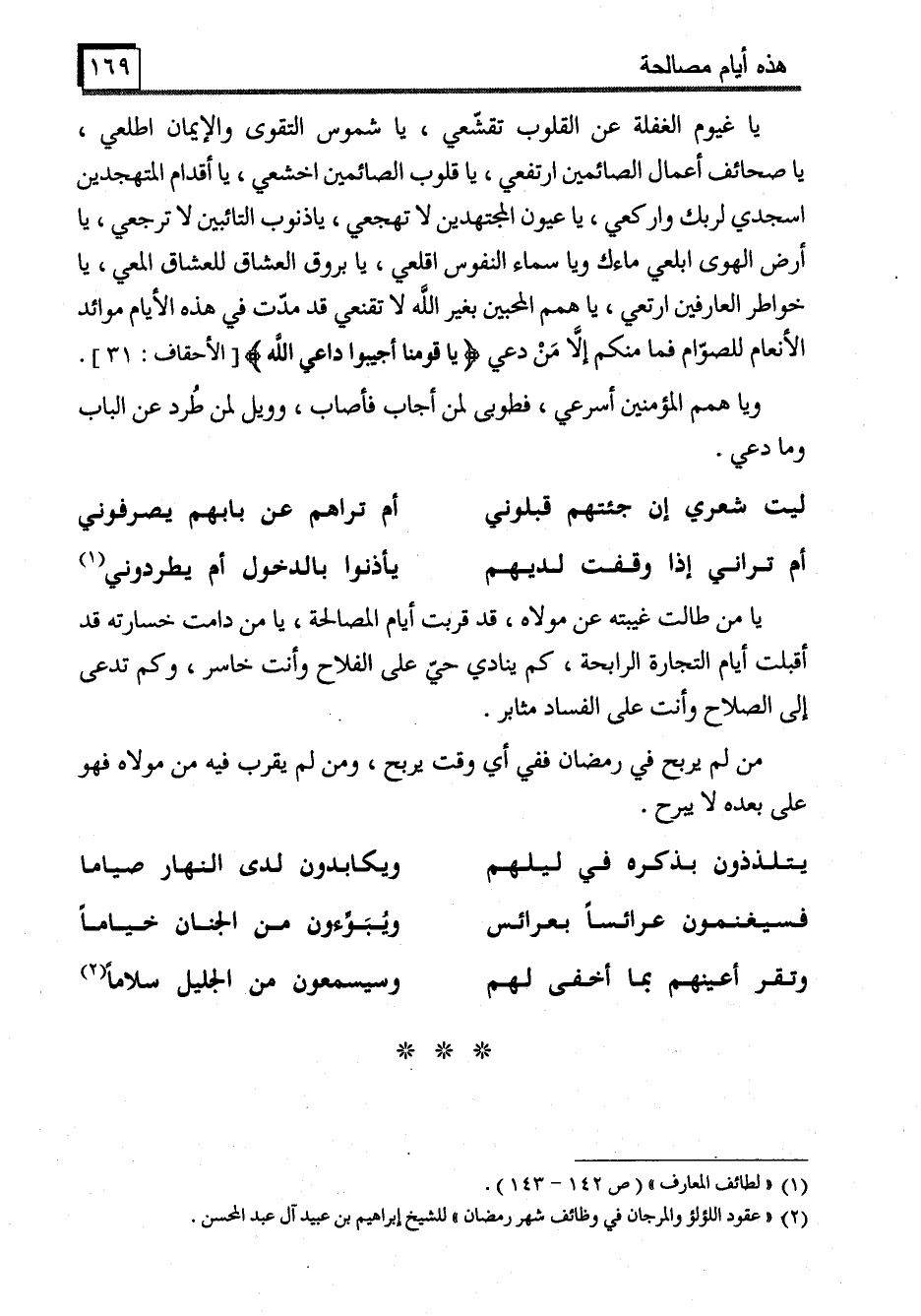 يا من طالت غيبته عن مولاه، قد قربت أيام المصالحة، يا من دامت خسارته قد أقبلت أيام التجارة الرابحة، كم ينادي حي على الفلاح وأنت خاسر، وكم تدعى إلى الصلاح وأنت على الفساد مثابر.