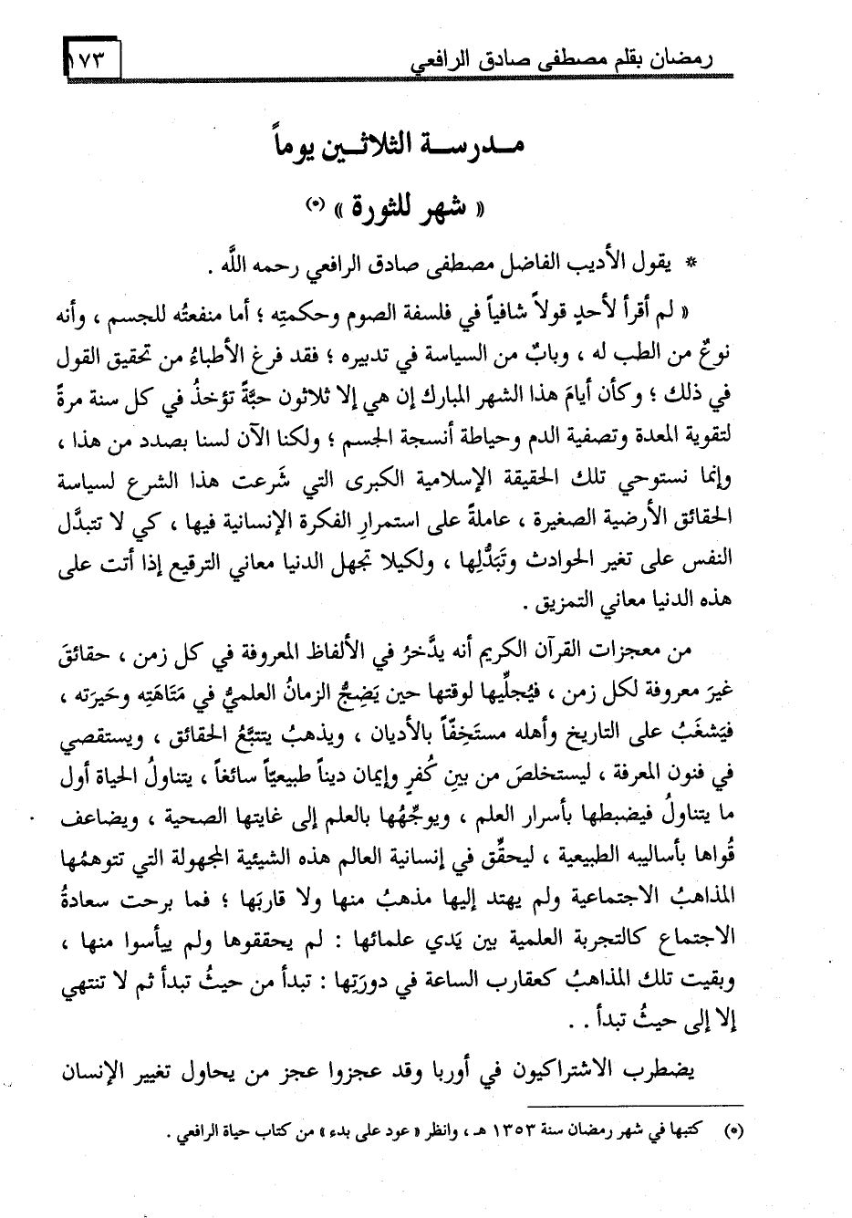 "لم أقرأ لأحد قولاً شافياً في فلسفة الصوم وحكمتِه؛ أما منفعتُه للجسم، وأنه نوعٌ من الطب له، وبابٌ من السياسة في تدبيره؛ فقد فرغ الأطباءُ من تحقيق القول في ذلك؛ وكأن أيامَ هذا الشهر المبارك إن هي إلا ثلاثون حبةً تؤخذُ في كل سنة مرةً لتقوية المعدة وتصفية الدم وحياطة أنسجة الجسم؛ ولكنا الآن لسنا بصدد من هذا، وإنما نستوحي تلك الحقيقة الإسلامية الكبرى التي شَرعت هذا الشرع لسياسة الحقائق الأرضية الصغيرة، عاملة على استمرارِ الفكرة الإنسانية فيها، كي لا تتبدَّل النفس على تغير الحوادث وتَبَدُّلِها، ولكيلا تجهل الدنيا معاني الترقيع إذا أتت على هذه الدنيا معاني التمزيق.
