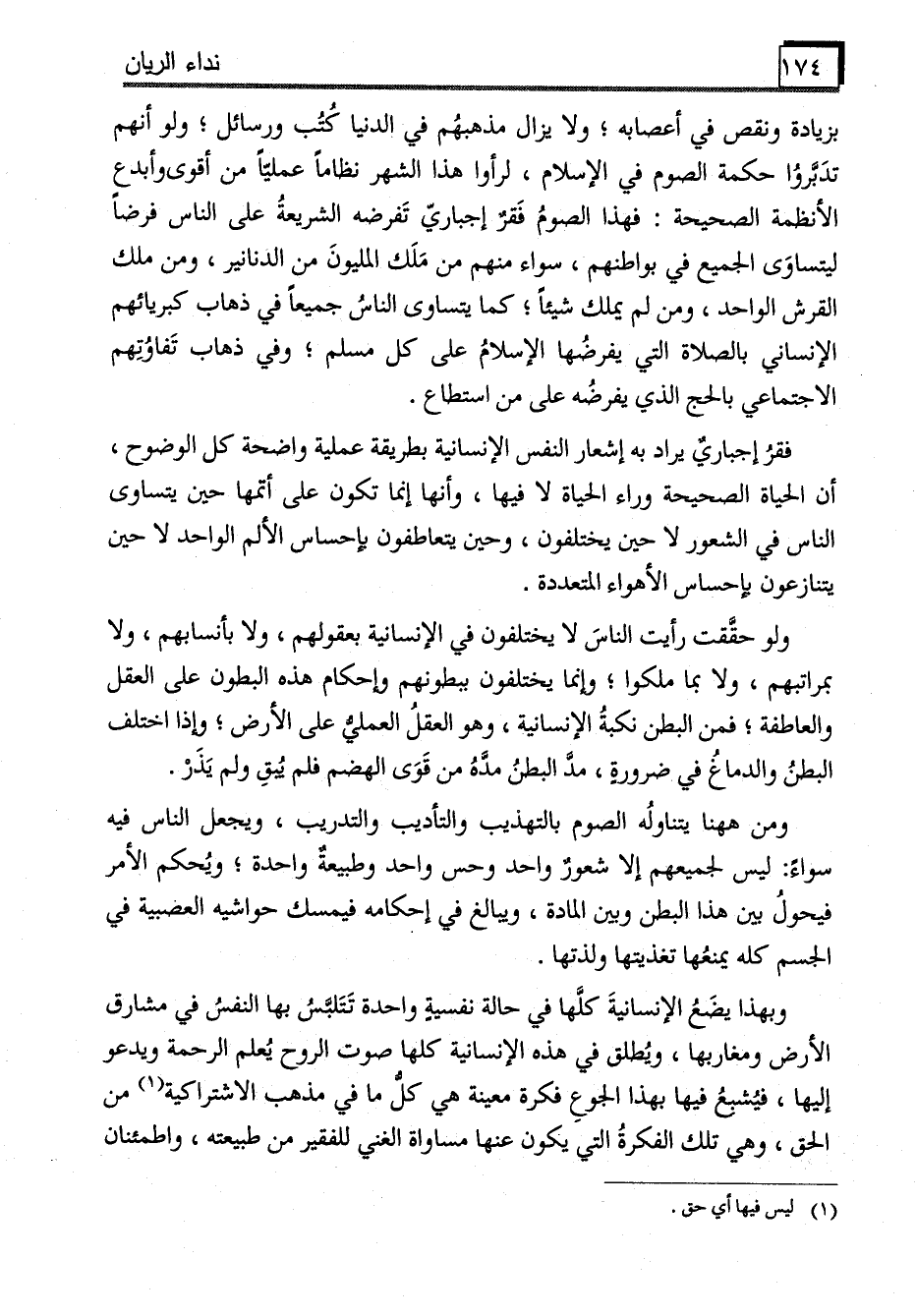 بزيادة ونقص في أعصابه؛ ولا يزال مذهبهُم في الدنيا كُتُب ورسائل؛ ولو أنهم تدَبروُا حكمة الصوم في الإسلام، لرأوا هذا الشهر نظاما عمليّا من أقوى وأبدع الأنظمة الصحيحة: فهذا الصومُ فَقر إجباريّ تَفرضه الشريعةُ على الناس فرضاً ليتساوَى الجميع في بواطنهم، سواء منهم من مَلَك المليونَ من الدنانير، ومن ملك القرش الواحد، ومن لم يملك شيئاً؛ كما يتساوى الناسُ جميعا في ذهاب كبريائهم الإنساني بالصلاة التي يفرضُها الإسلام على كل مسلم؛ وفي ذهاب تَفاوُتِهم الاجتماعي بالحج الذي يفرضُه على من استطاع.