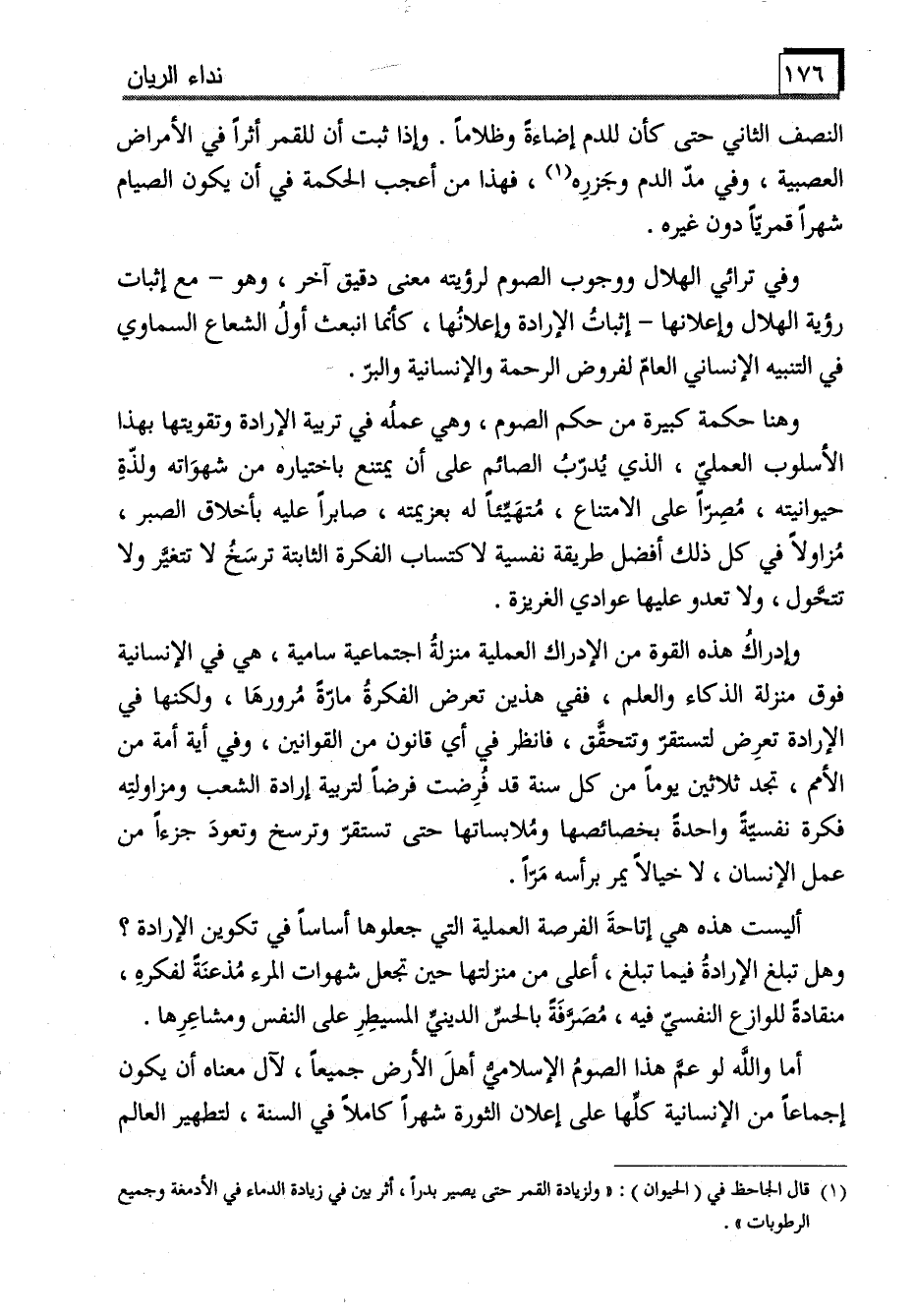 النصف الثاني حتى كأن للدم إضاءة وظلاماً. وإذا ثبت أن للقمر أثراً في الأمراض العصبية، وفي مدّ الدم وجَزرِه (1) ، فهذا من أعجب الحكمة في أن يكون الصيام شهراً قمريّا دون غيره.