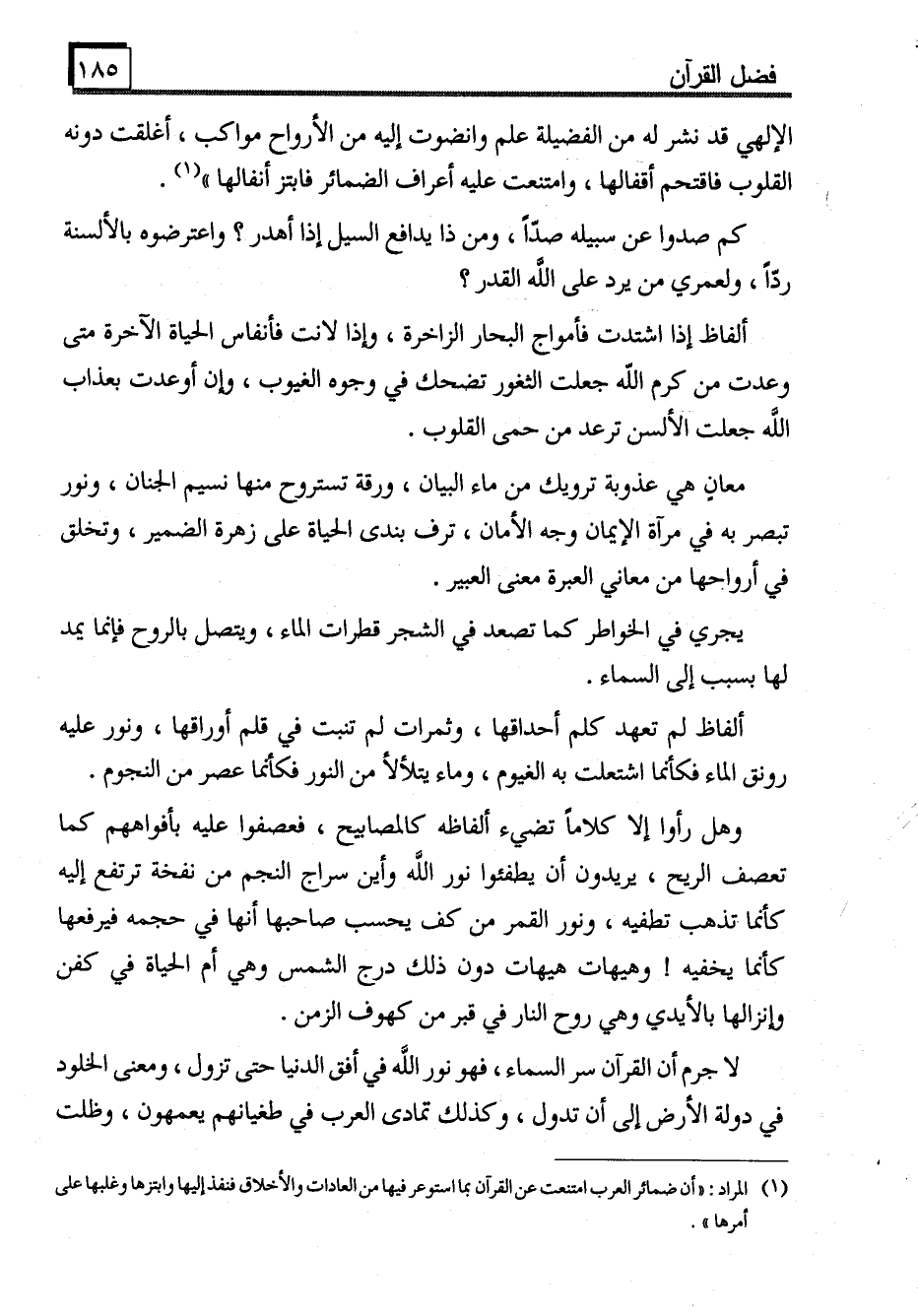 لا جرم أن القرآن سر السماء، فهو نور الله في أفق الدنيا حتى تزول، ومعنى الخلود في دولة الأرض إلى أن تدول، وكذلك تمادى العرب في طغيانهم يعمهون، وظلت