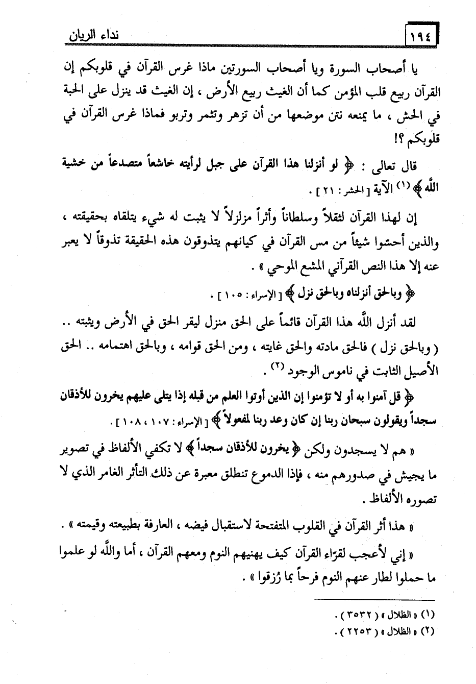 يا أصحاب السورة ويا أصحاب السورتين ماذا غرس القرآن في قلوبكم إن القرآن ربيع قلب المؤمن كما أن الغيث ربيع الأرض، إن الغيث قد ينزل على الحبة في الحش، ما يمنعه نتن موضعها من أن تزهر وتثمر وتربو فماذا غرس القرآن في قلوبكم؟!