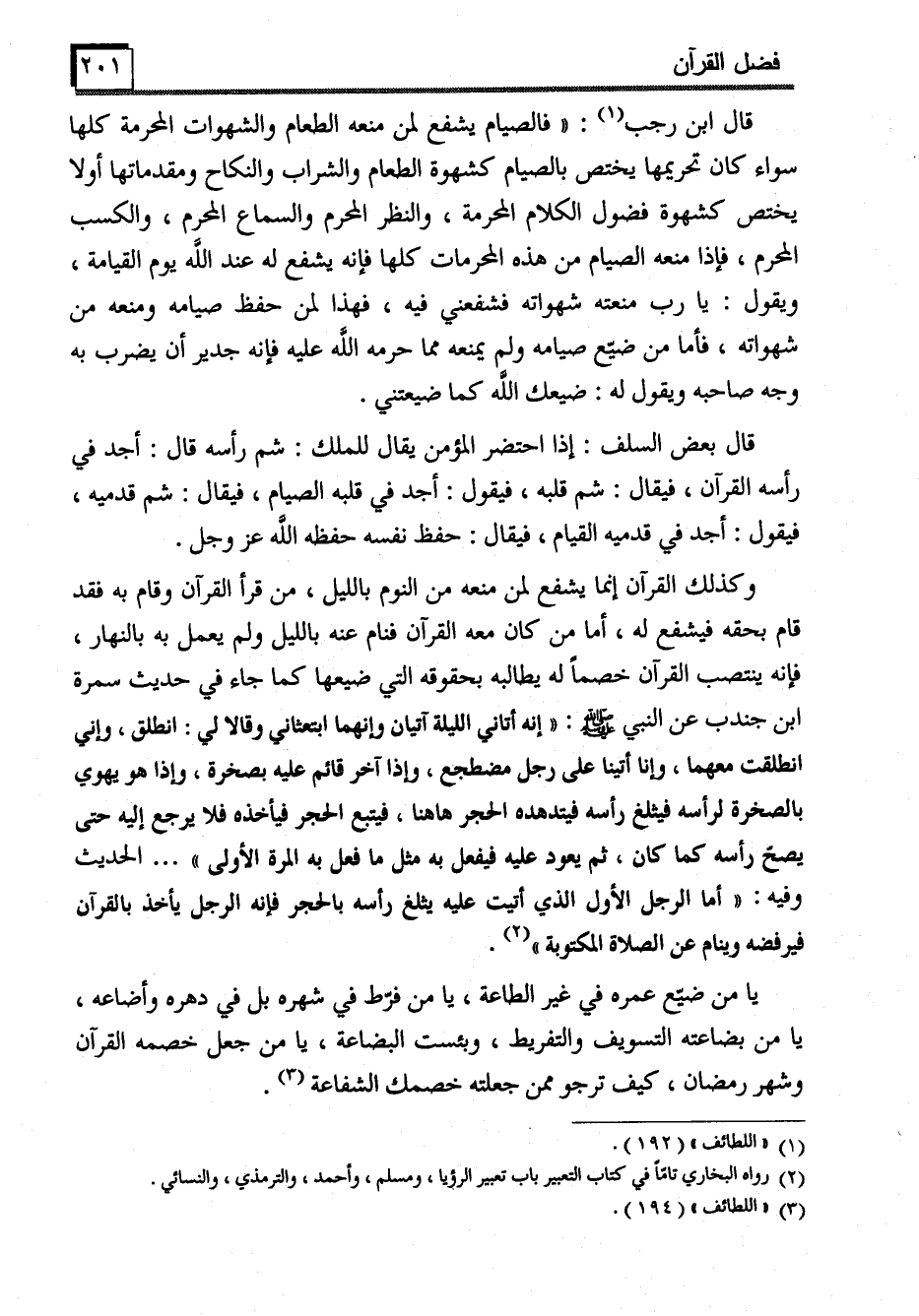 وكذلك القرآن إنما يشفع لمن منعه من النوم بالليل، من قرأ القرآن وقام به فقد قام بحقه فيشفع له، أما من كان معه القرآن فنام عنه بالليل ولم يعمل به بالنهار، فإنه ينتصب القرآن خصماً له يطالبه بحقوقه التي ضيعها كما جاء في حديث سمرة ابن جندب عن النبي - صَلَّى اللَّهُ عَلَيْهِ وَسَلَّمَ -: "إنه أتاني الليلة آتيان وإنهما ابتعثاني وقالا لي: انطلق، وإني انطلقت معهما، وإنا أتينا على رجل مضطجع، وإذا آخر قائم عليه بصخرة، وإذا هو يهوي بالصخرة لرأسه فيثلغ رأسه فيتدهده الحجر هاهنا، فيتبع الحجر فيأخذه فلا ورجع إليه حتى يصحّ رأسه كما كان، ثم يعود عليه فيفعل به مثل ما فعل به المرة الأولى" ... الحديث وفيه: "أما الرجل الأول الذي أتيت عليه يثلغ رأسه بالحجر فإنه الرجل يأخذ بالقرآن فيرفضه وينام عن الصلاة المكتوبة" (2) .