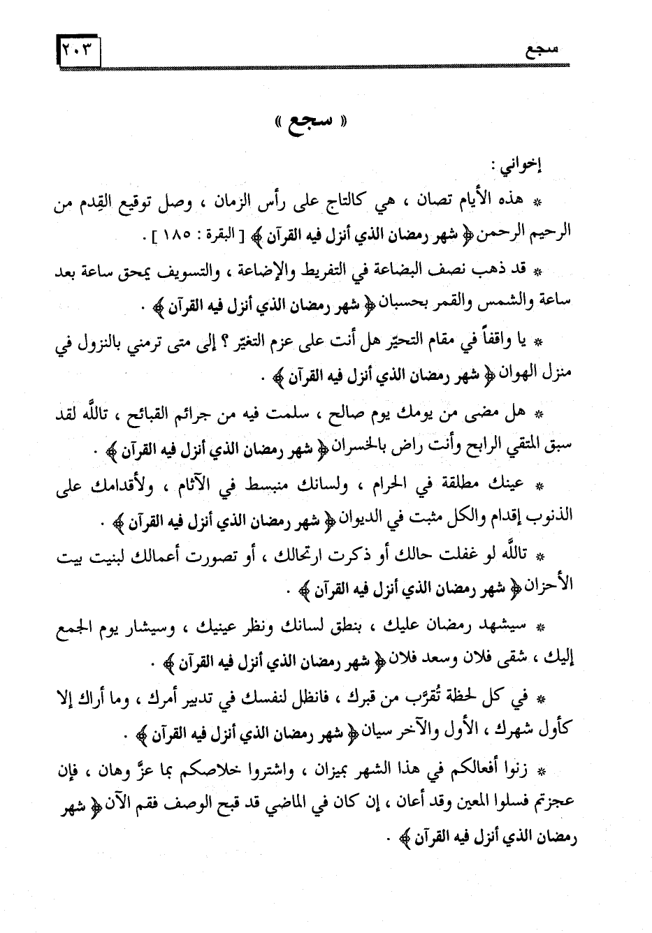 * هل مضى من يومك يوم صالح، سلمت فيه من جرائم القبائح، تالله لقد سبق المتقي الرابح وأنت راض بالخسران (شهر رمضان الذي أنزل فيه القرآن) .
