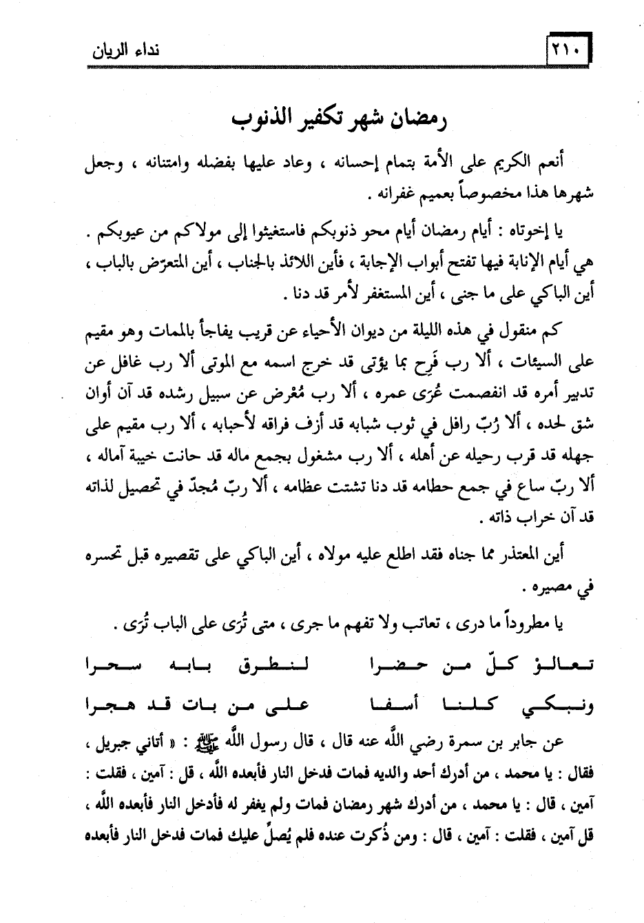 كم منقول في هذه الليلة من ديوان الأحياء عن قريب يفاجأ بالممات وهو مقيم على السيئات، ألا رب فَرِح بما يؤتى قد خرج اسمه مع الموتى ألا رب غافل عن تدبير أمره قد انفصمت عُرَى عمره، ألا رب مُعْرض عن سبيل رشده قد آن أوان شق لحده، ألا رُبّ رافل في ثوب شبابه قد أزف فراقه لأحبابه، ألا رب مقيم على جهله قد ترب رحيله عن أهله، ألا رب مشغول بجمع ماله قد حانت خيبة آماله، ألا ربّ ساع في جمع حطامه قد دنا تشتت عظامه، ألا ربّ مُجدّ في تحصيل لذاته قد آن خراب ذاته.
