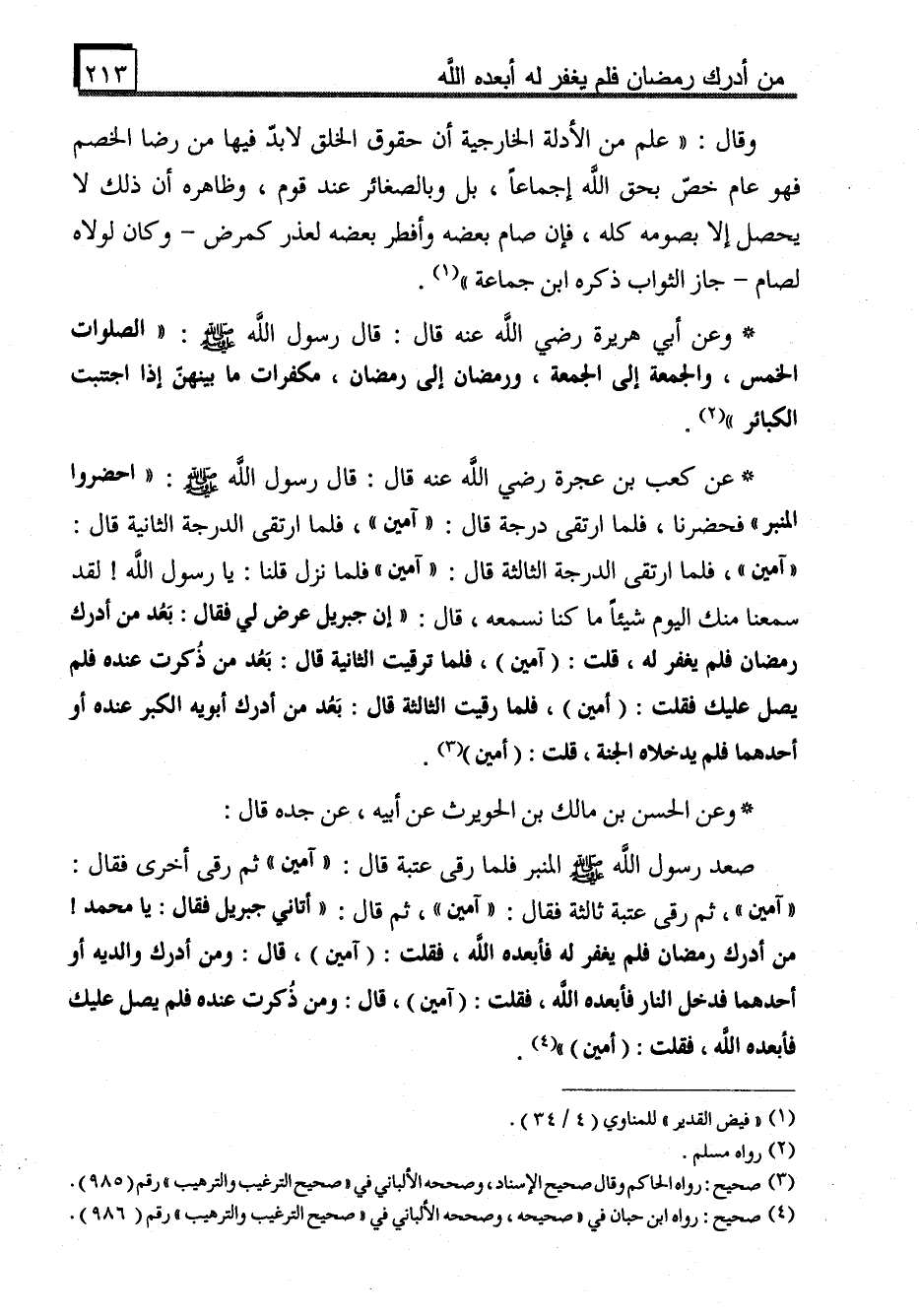 * عن كعب بن عجرة رضي الله عنه قال: قال رسول الله - صَلَّى اللَّهُ عَلَيْهِ وَسَلَّمَ -: "احضروا المنبر" فحضرنا، فلما ارتقى درجة قال: "آمين"، فلما ارتقى الدرجة الثانية قال: "آمين"، فلما ارتقى الدرجة الثالثة قال: "آمين" فلما نزل قلنا: يا رسول الله! لقد سمعنا منك اليوم شيئاً ما كنا نسمعه، قال: (إن جبريل عرض لي فقال: بَعُد من أدرك رمضان فلم يغفر له، قلت: (آمين) ، فلما ترقيت الثانية قال: بَعُد من ذُكرت عنده فلم يصل عليك فقلت: (آمين) ، فلما رقيت الثالثة قال: بَعُد من أدرك أبويه الكبر عنده أو أحدهما فلم يدخلاه الجنة، قلت: (آمين) (3) .