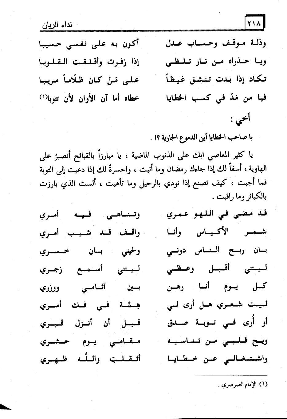 يا كثير المعاصي ابك على الذنوب الماضية، يا مبارزاً بالقبائح أتصبر على الهاوية، أسفاً لك إذا جاءك رمضان وما أنبت، واحسرةً لك إذا دعيت إلى التوبة فما أجبت، كيف تصنع إذا نودي بالرحيل وما تأهبت، ألست الذي بارزت بالكبائر وما راقبت.