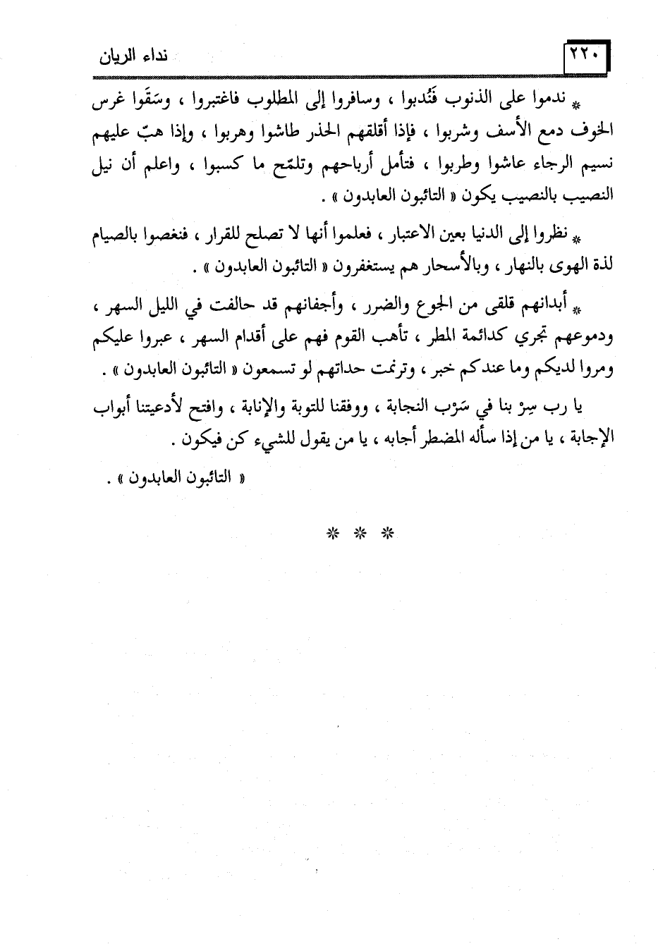 * ندموا على الذنوب فَنُدبوا، وسافروا إلى المطلوب فاغتبروا، وسَقَوا غرس الخوف دمع الأسف وشربوا، فإذا أقلقهم الحذر طاشوا وهربوا، وإذا هبّ عليهم نسيم الرجاء عاشوا وطربوا، فتأمل أرباحهم وتلمّح ما كسبوا، واعلم أن نيل النصيب بالنصيب يكون "التائبون العابدون".