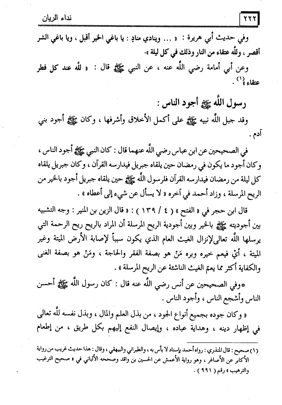 في الصحيحين عن ابن عباس رضي الله عنهما قال: كان النبي - صَلَّى اللَّهُ عَلَيْهِ وَسَلَّمَ - أجود الناس، وكان أجود ما يكون في رمضان حين يلقاه جبريل فيدارسه القرآن، وكان جبريل يلقاه كل ليلة من رمضان فيدارسه القرآن فلرسول الله - صلى الله عليه وسلم - حين يلقاه جبريل أجود بالخير من الريح المرسلة، وزاد أحمد في آخره "لا يسأل عن شيء إلى أعطاه".