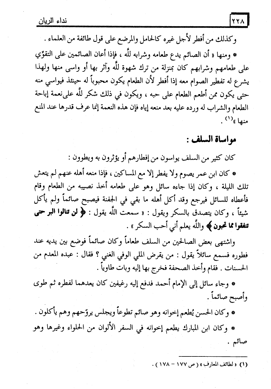 واشتهى بعض الصالحين من السلف طعاماً وكان صائماً فوضع بين يديه عند فطوره فسمع سائلاً يقول: من يقوض الملي الوفي الغني؟ فقال: عبده المعدم من الحسنات. فقام وأخذ الصحفة فخرج بها إليه وبات طاوياً.