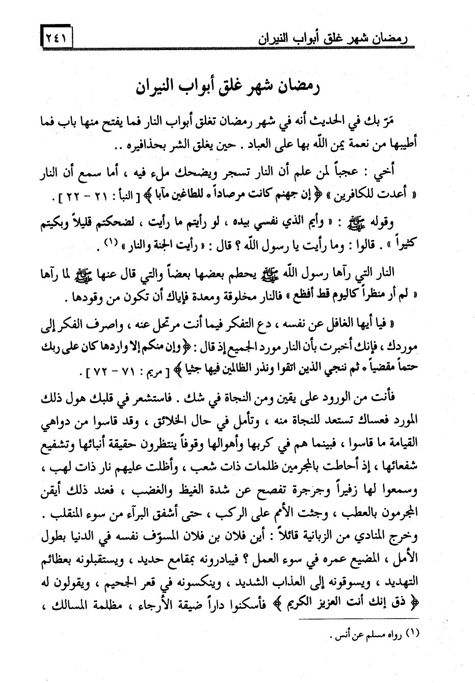 مَر بك في الحديث أنه في شهر رمضان تغلق أبواب النار فما يفتح منها باب فما أطيبها من نعمة يمن الله بها على العباد. حين يغلق الشر بحذافيره..