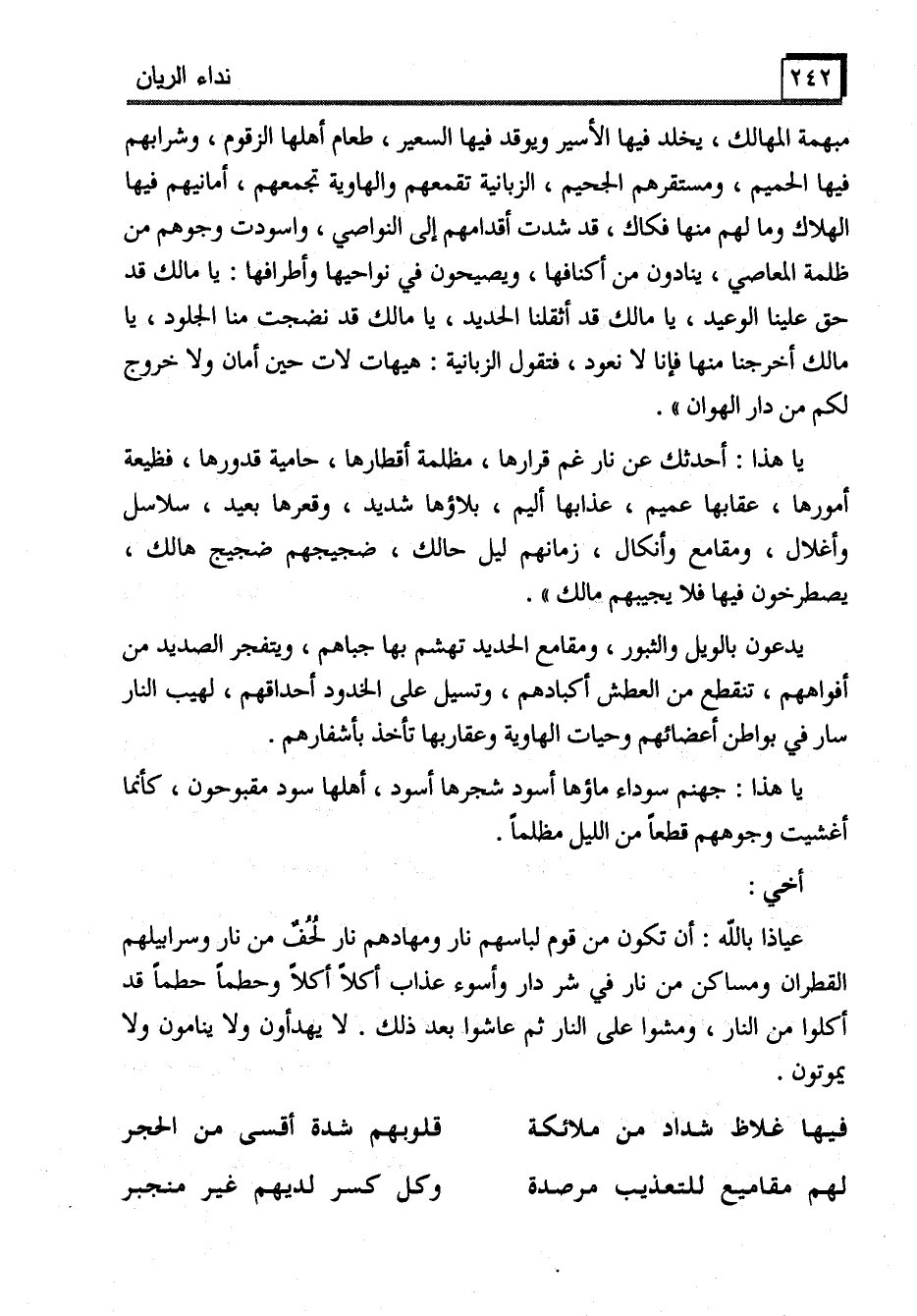 مبهمة المهالك، يخلد فيها الأسير ويوقد فيها السعير، طعام أهلها الزقوم، وشرابهم فيها الحميم، ومستقرهم الجحيم، الزبانية تقمعهم والهاوية تجمعهم، أمانيهم فيها الهلاك وما لهم منها فكاك، قد شدت أقدامهم إلى النواصي، واسودت وجوهم من ظلمة المعاصي، ينادون من أكنافها، ويصيحون في نواحيها وأطرافها: يا مالك قد حق علينا الوعيد، يا مالك قد أثقلنا الحديد، يا مالك قد نضجت منا الجلود، يا مالك أخرجنا منها فإنا لا نعود، فتقول الزبانية: هيهات لات حين أمان ولا خروج لكم من دار الهوان".