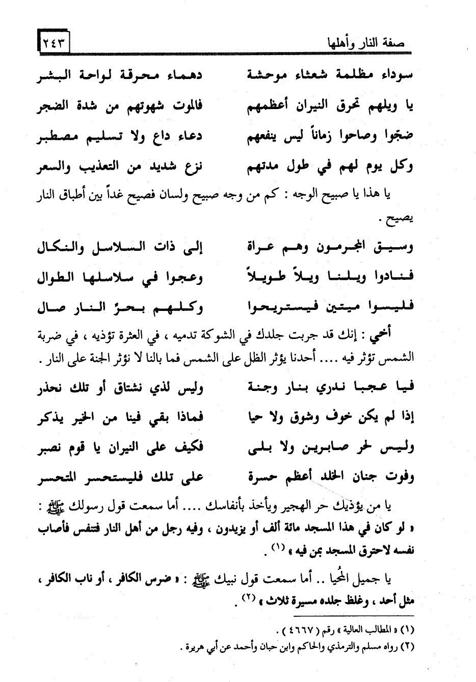وفوت جنان الخلد أعظم حسرة على تلك فليستحسر المتحسر يا من يؤذيك حر الهجير ويأخذ بأنفاسك.... أما سمعت قول رسولك - صَلَّى اللَّهُ عَلَيْهِ وَسَلَّمَ -: "لو كان في هذا المسجد مائة ألف أو يزيدون، وفيه رجل من أهل النار فتنفس فأصاب نفسه لاحترق المسجد بمن فيه" (1) .
