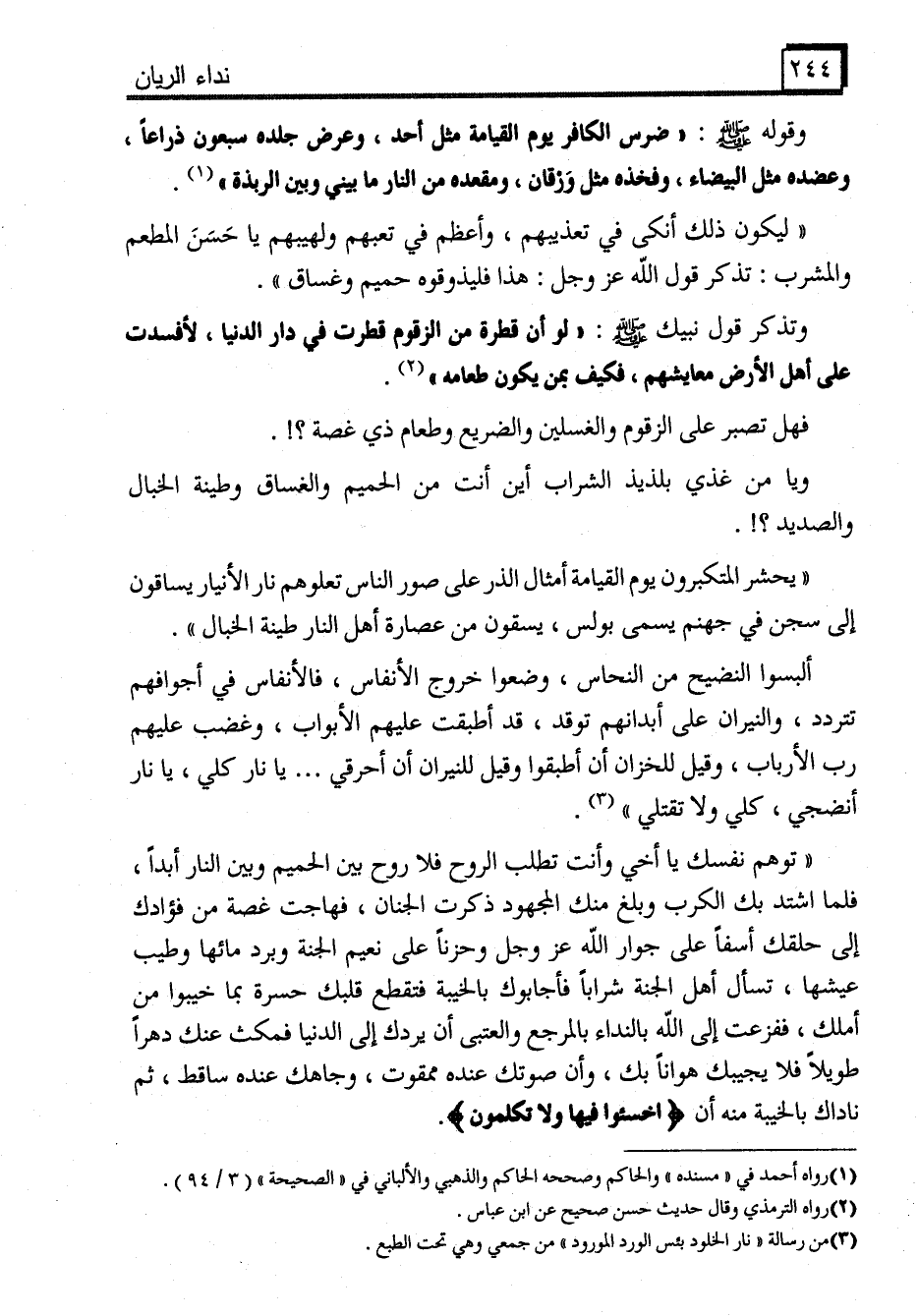 "توهم نفسك يا أخي وأنت تطلب الروح فلا روح بين الحميم وبين النار أبداً، فلما اشتد بك الكرب وبلغ منك المجهود ذكرت الجنان، فهاجت غصة من فؤادك إلى حلقك أسفاً على جوار الله عز وجل وحزناً على نعيم الجنة وبرد مائها وطيب عيشها، تسأل أهل الجنة شراباً فأجابوك بالخيبة فتقطع قلبك حسرة بما خيبوا من أملك، ففزعت إلى الله بالنداء بالمرجع والعتبى أن يردك إلى الدنيا فمكث عنك دهراً طويلاً فلا يجيبك هواناً بك، وأن صوتك عنده ممقوت، وجاهك عنده ساقط، ثم ناداك بالخيبة منه أن (اخسئوا فيها ولا تكلمون) .