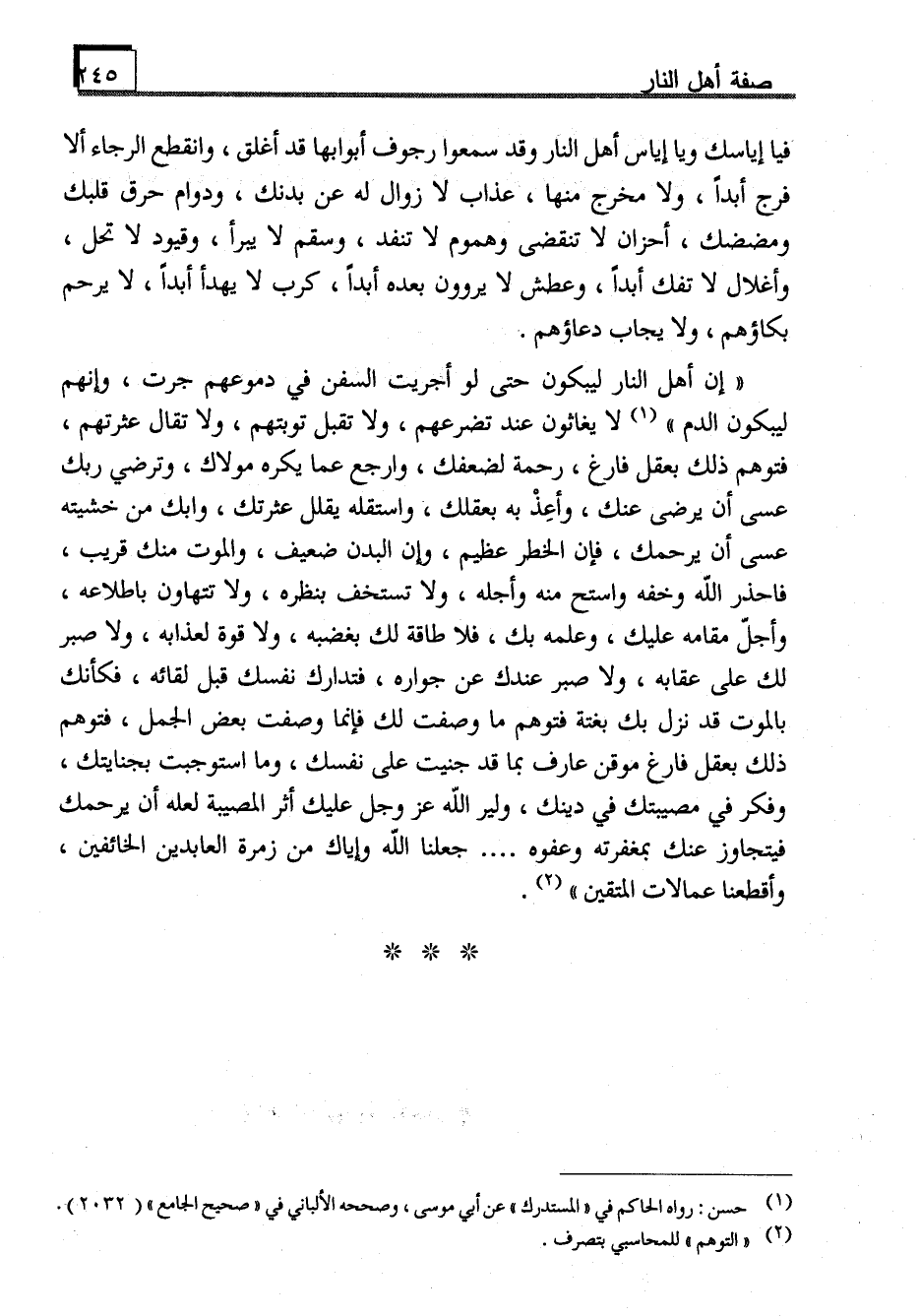 فيا إياسك ويا إياس أهل النار وقد سمعوا رجوف أبوابها قد أغلق، وانقطع الرجاء ألا فرج أبداً، ولا مخرج منها، عذاب لا زوال له عن بدنك، ودوام حرق قلبك ومضضك، أحزان لا تنقضى وهموم لا تنفد، وسقم لا يبرأ، وقيود لا تحل، وأغلال لا تفك أبداً، وعطش لا يروون بعده أبدا، كرب لا يهدأ أبداً، لا يرحم بكاؤهم، ولا يجاب دعاؤهم.