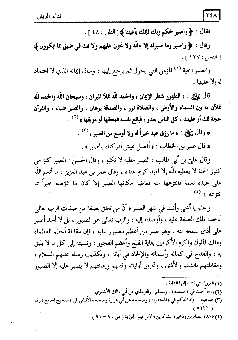 (4) "عدة الصابرين وذخيرة الشاكرين" لابن قيم الجوزية (ص 90-91) .