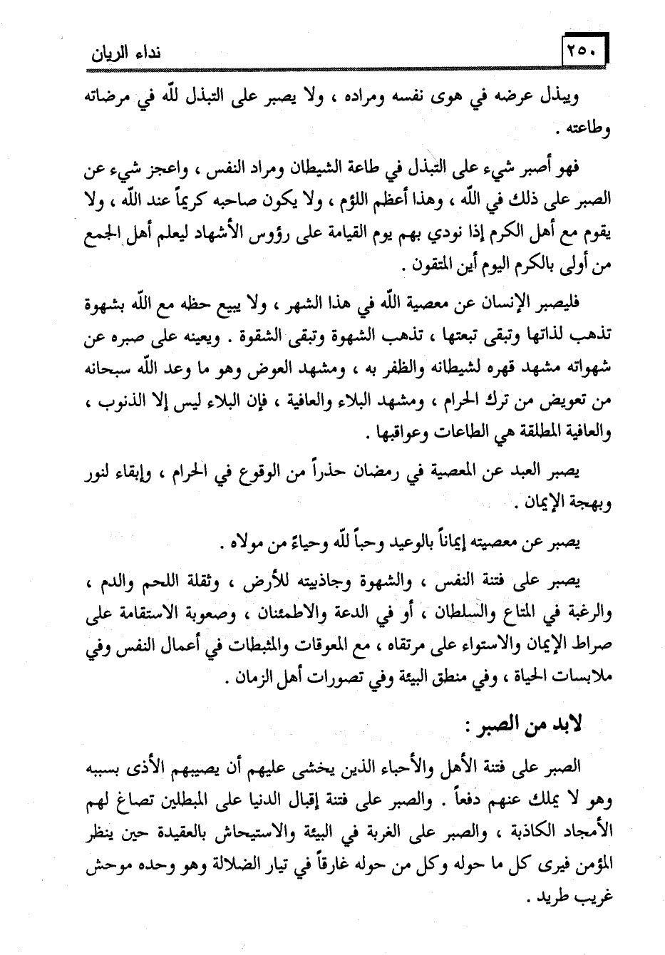 فليصبر الإنسان عن معصية الله في هذا الشهر، ولا يبيع حظه مع الله بشهوة تذهب لذاتها وتبقى تبعتها، تذهب الشهوة وتبقى الشقوة. ويعينه على صبره عن شهواته مشهد قهره لشيطانه والظفر به، ومشهد العوض وهو ما وعد الله سبحانه من تعويض من ترك الحرام، ومشهد البلاء والعافية، فإن البلاء ليس إلا الذنوب، والعافية المطلقة هي الطاعات وعواقبها.