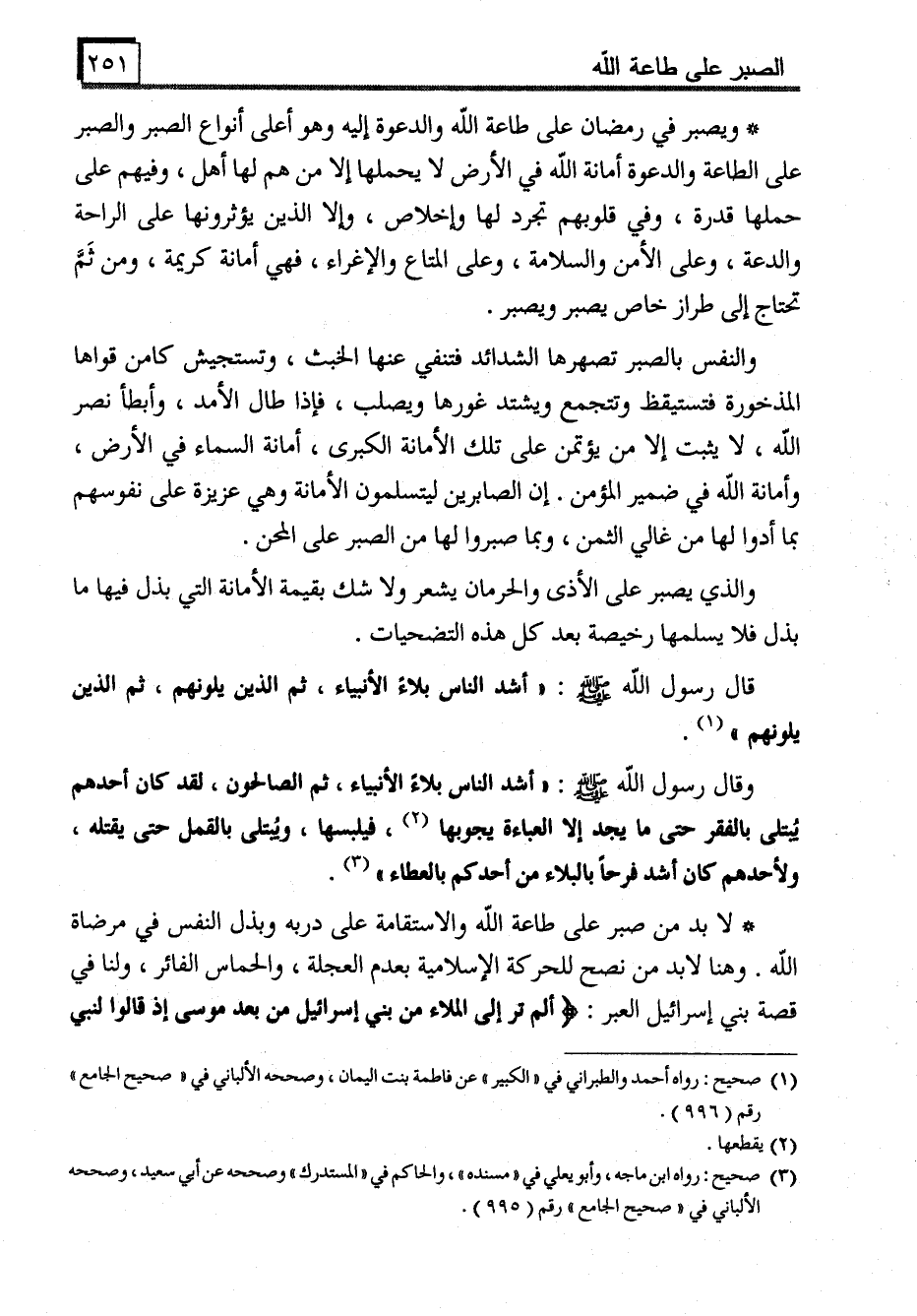 * ويصبر في رمضان على طاعة الله والدعوة إليه وهو أعلى أنواع الصبر والصبر على الطاعة والدعوة أمانة الله في الأرض لا يحملها إلا من هم لها أهل، وفيهم على حملها قدرة، وفي قلوبهم تجرد لها وإخلاص، وإلا الذين يؤثرونها على الراحة والدعة، وعلى الأمن والسلامة، وعلى المتاع والإغراء، فهي أمانة كريمة، ومن ثَمَّ تحتاج إلى طراز خاص يصبر ويصبر.