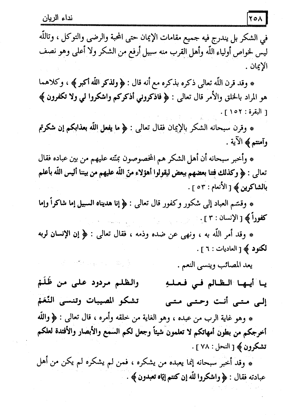 في الشكر بل يندرج فيه جميع مقامات الإيمان حتى المحبة والرضى والتوكل، وتالله ليس لخواص أولياء الله وأهل القرب منه سبيل أرفع من الشكر ولا أعلى وهو نصف الإيمان.
