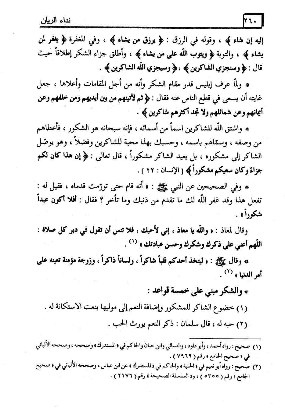 * واشتق الله للشاكرين اسماً من أسمائه، فإنه سبحانه هو الشكور، فأعطاهم من وصفه، وسمّاهم باسمه، وحسبك بهذا محبة للشاكرين وفضلاً، وهو يوصّل الشاكر إلى مشكوره، بل يعيد الشاكر مشكوراً، قال تعالى: (إن هذا كان لكم جزاءً وكان سعيكم مشكوراً) [الإنسان: 22] .