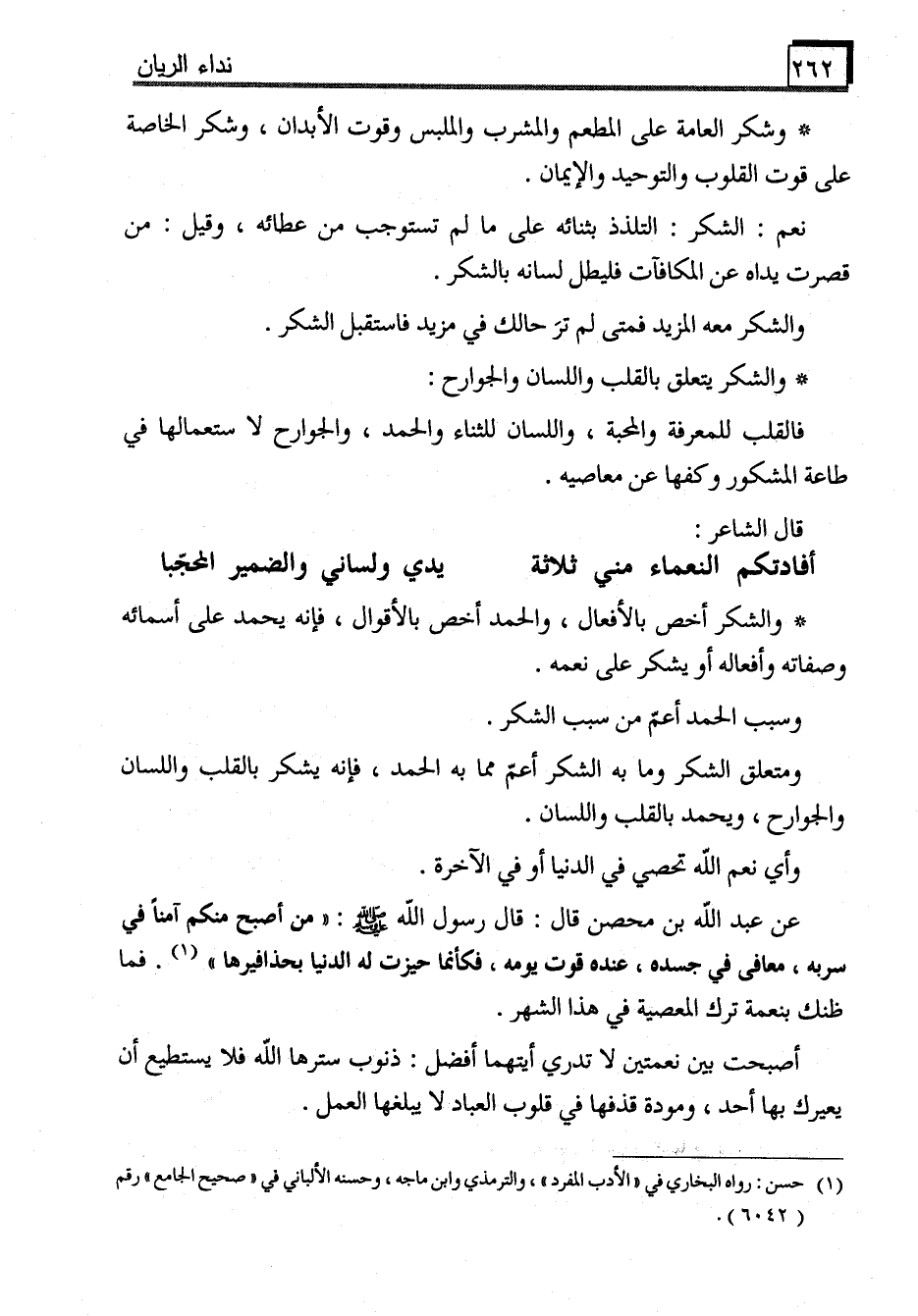 * وشكر العامة على المطعم والمشرب والملبس وقوت الأبدان، وشكر الخاصة على قوت القلوب والتوحيد والإيمان.