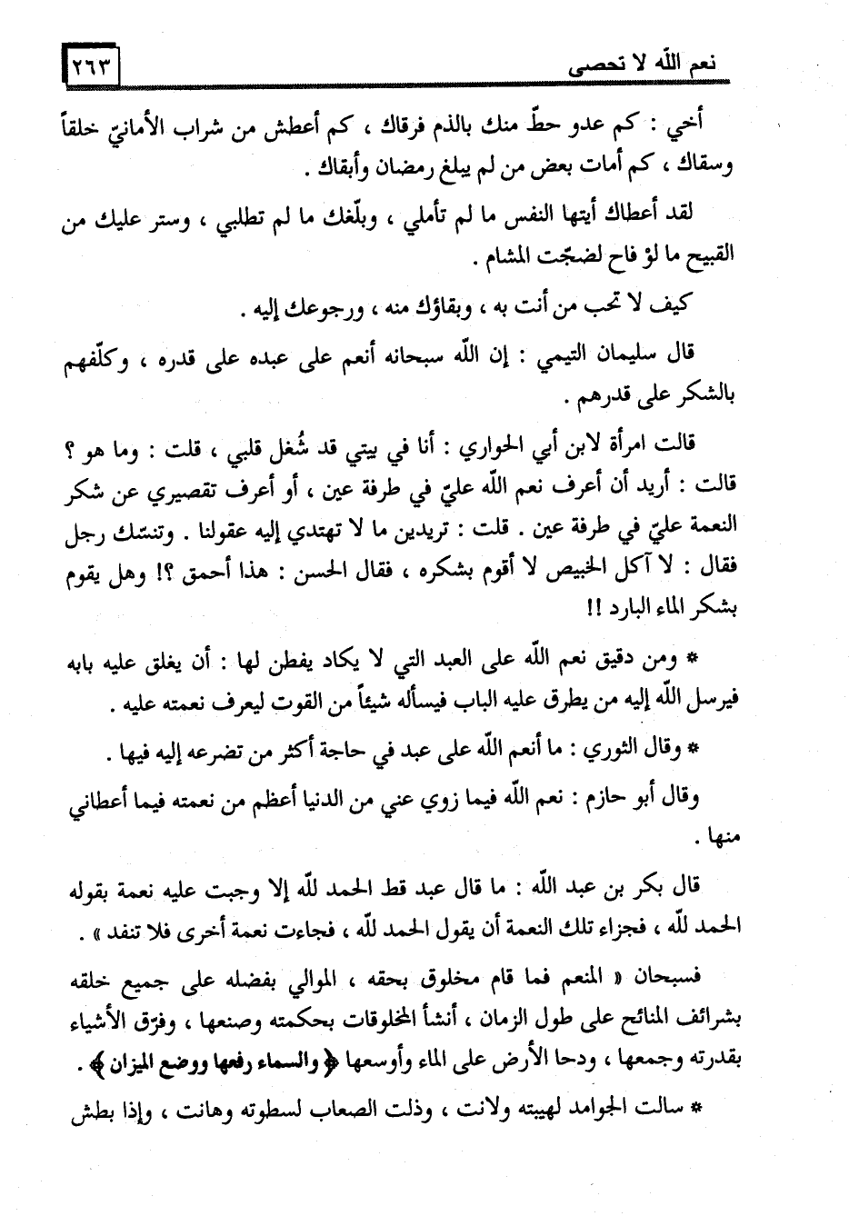 قالت: أريد أن أعرف نعم الله عليّ في طرفة عين، أو أعرف تقصيري عن شكر النعمة عليّ في طرفة عين. قلت: تريدين ما لا تهتدي إليه عقولنا. وتنسّك رجل فقال: لا آكل الخبيص لا أقوم بشكره، فقال الحسن: هذا أحمق؟! وهل يقوم بشكر الماء البارد!!