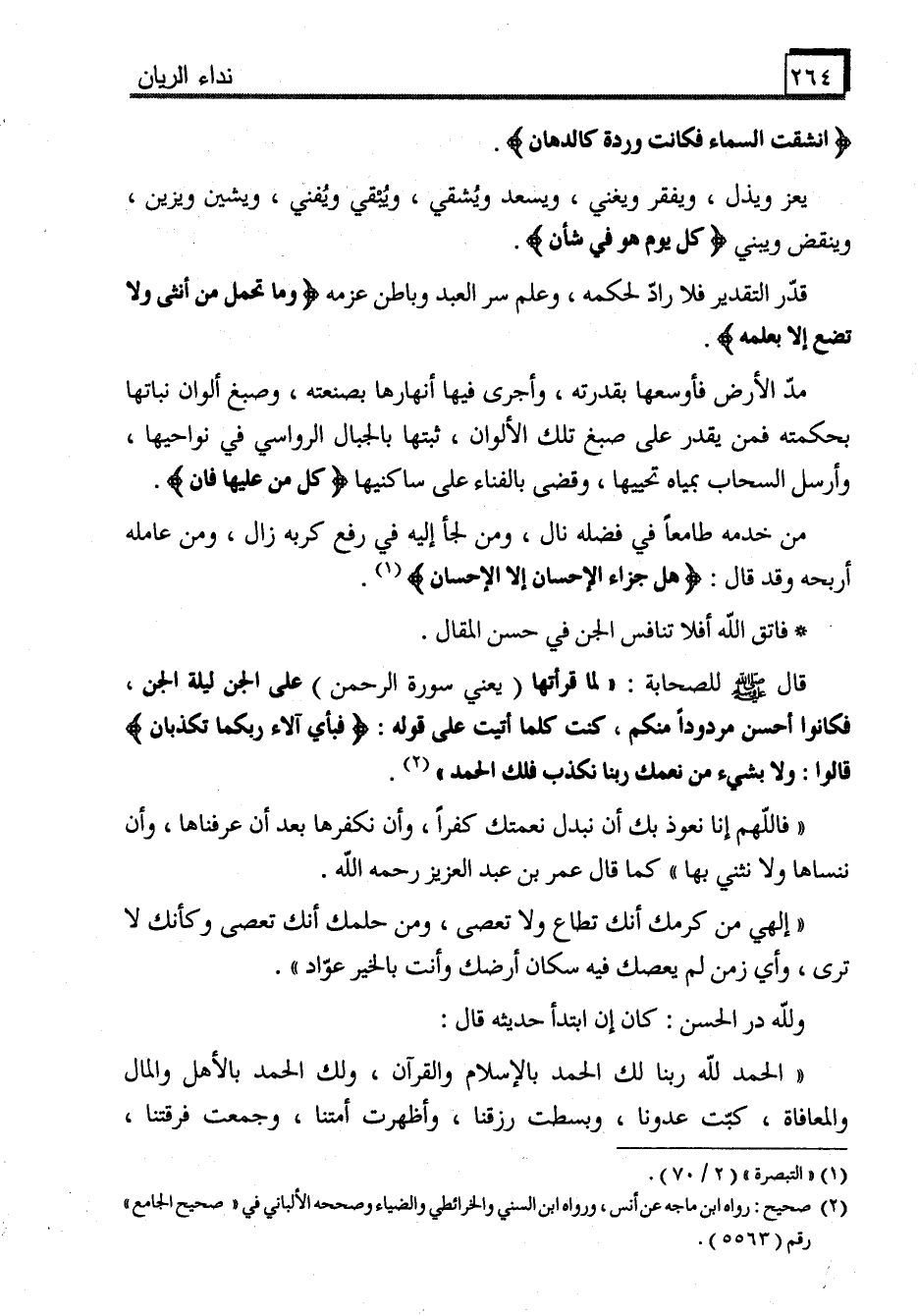 قال - صَلَّى اللَّهُ عَلَيْهِ وَسَلَّمَ - للصحابة: "لما قرأتها (يعني سورة الرحمن) على الجن ليلة الجن، فكانوا أحسن مردوداً منكم، كنت كلما أتيت على قوله: (فبأي آلاء ربكما تكذبان) قالوا: ولا بشيء من نعمك ربنا نكذب فلك الحمد" (2) .