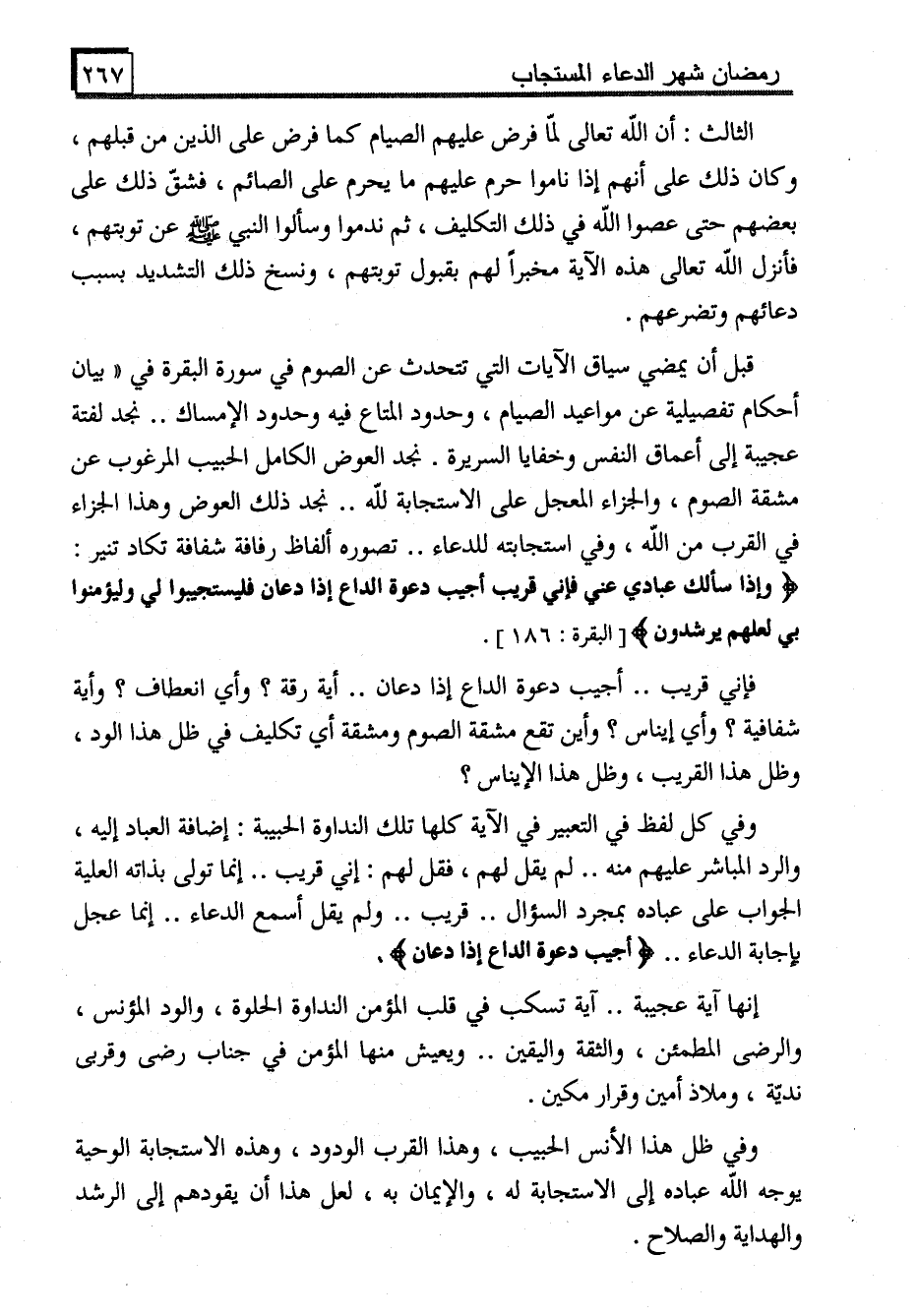 قبل أن يمضي سياق الآيات التي تتحدث عن الصوم في سورة البقرة في "بيان أحكام تفصيلية عن مواعيد الصيام، وحدود المتاع فيه وحدود الإمساك.. نجد لفتة عجيبة إلى أعماق النفس وخفايا السريرة. نجد العوض الكامل الحبيب المرغوب عن مشقة الصوم، والجزاء المعجل على الاستجابة لله.. نجد ذلك العوض وهذا الجزاء في القرب من الله، وفي استجابته للدعاء.. تصوره ألفاظ رفافة شفافة تكاد تنير: (وإذا سألك عبادي عني فإني قريب أجيب دعوة الداع إذا دعان فليستجيبوا لي وليؤمنوا بي لعلهم يرشدون) [البقرة: 186] .