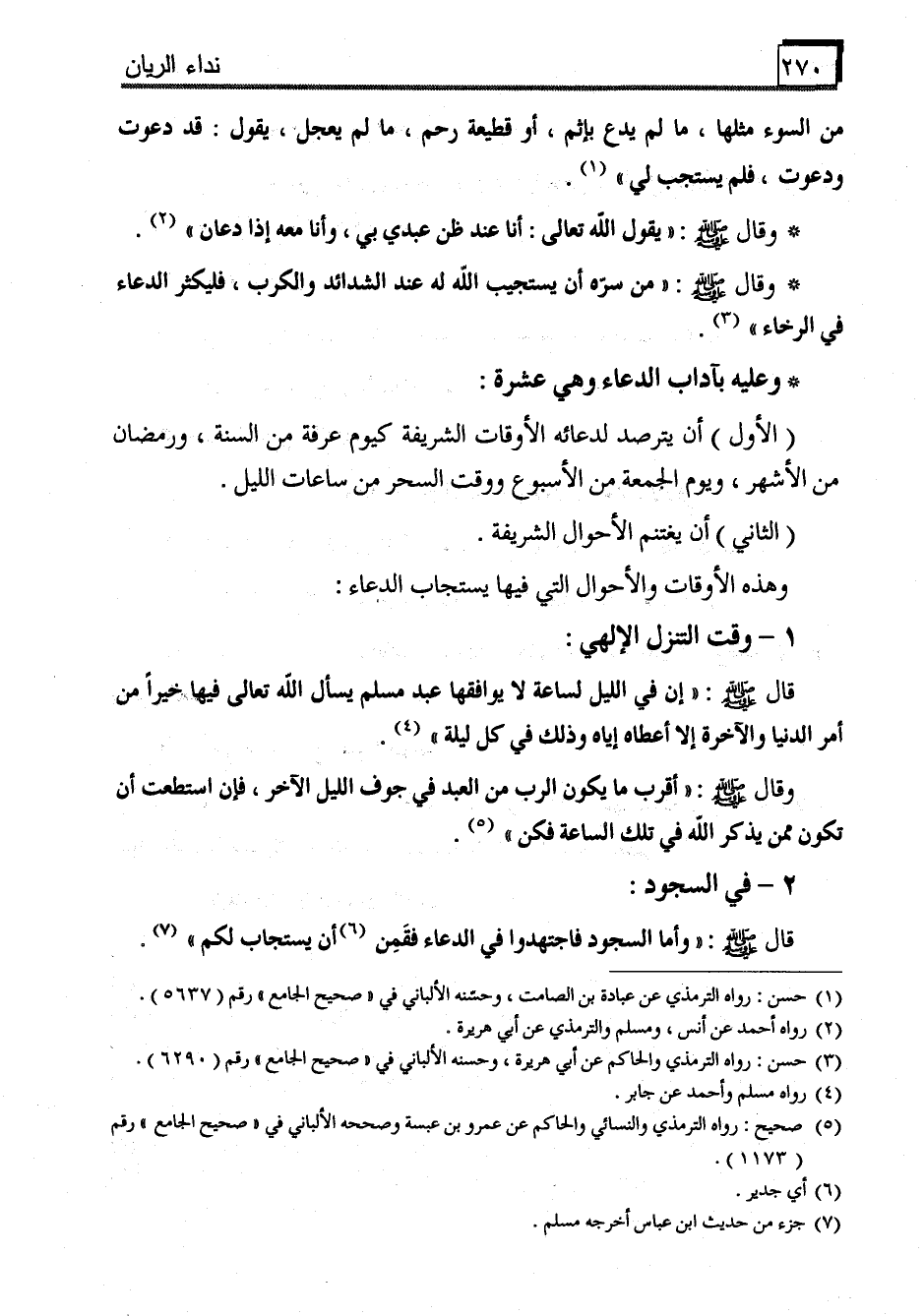 قال - صَلَّى اللَّهُ عَلَيْهِ وَسَلَّمَ -: "وأما السجود فاجتهدوا في الدعاء فقَمِن (6) أن يستجاب لكم" (7) .