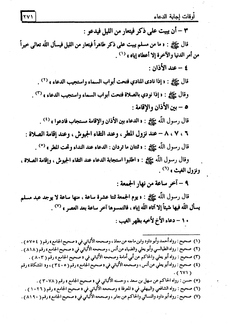 وقال رسول الله - صَلَّى اللَّهُ عَلَيْهِ وَسَلَّمَ -: "اطلبوا استجابة الدعاء عند التقاء الجيوش، وإقامة الصلاة، ونزول الغيث" (6) .
