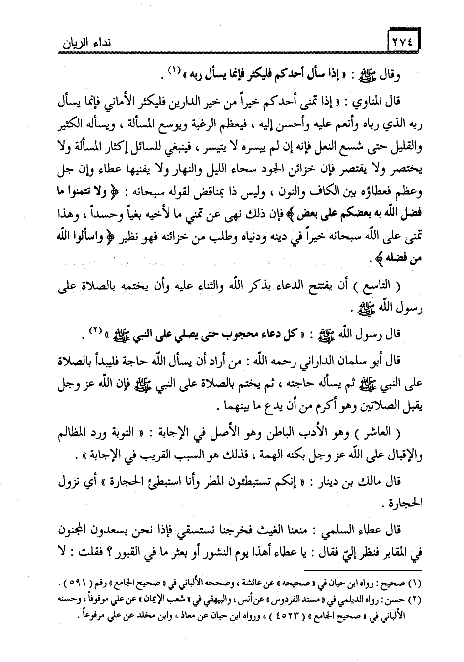 (التاسع) أن يفتتح الدعاء بذكر الله والثناء عليه وأن يختمه بالصلاة على رسول الله - صَلَّى اللَّهُ عَلَيْهِ وَسَلَّمَ -.