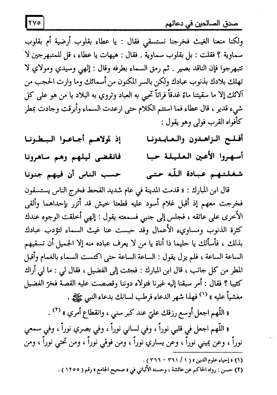 قال ابن المبارك: "قدمت المدينة في عام شديد القحط فخرج الناس يستسقون فخرجت معهم إذ أقبل غلام أسود عليه قطعتا خيش قد أتزر بإحداهما وألقى الأخرى على عاتقه، فجلس إلى جنبي فسمعته يقول: إلهي أخلقت الوجوه عندك كثرة الذنوب ومساويء الأعمال وقد حبست عنا غيث السماء لتؤدب عبادك بذلك، فأسألك يا حليما ذا أناة يا من لا يعرف عباده منه إلا الجميل أن تسقيهم الساعة الساعة، فلم يزل يقول: الساعة الساعة حتى اكتست السماء بالغمام وأقبل المطر من كل جانب، قال ابن المبارك: فجئت إلى الفضيل، فقال لي: ما لي أراك كئيبا؟ فقال: أمر سبقنا إليه غيرنا فتولاه دوننا وقصصت عليه القصة فخر الفضيل مغشياً عليه" (1) فهذا شهر الدعاء فرطب لسانك بدعاء النبي - صَلَّى اللَّهُ عَلَيْهِ وَسَلَّمَ -.
