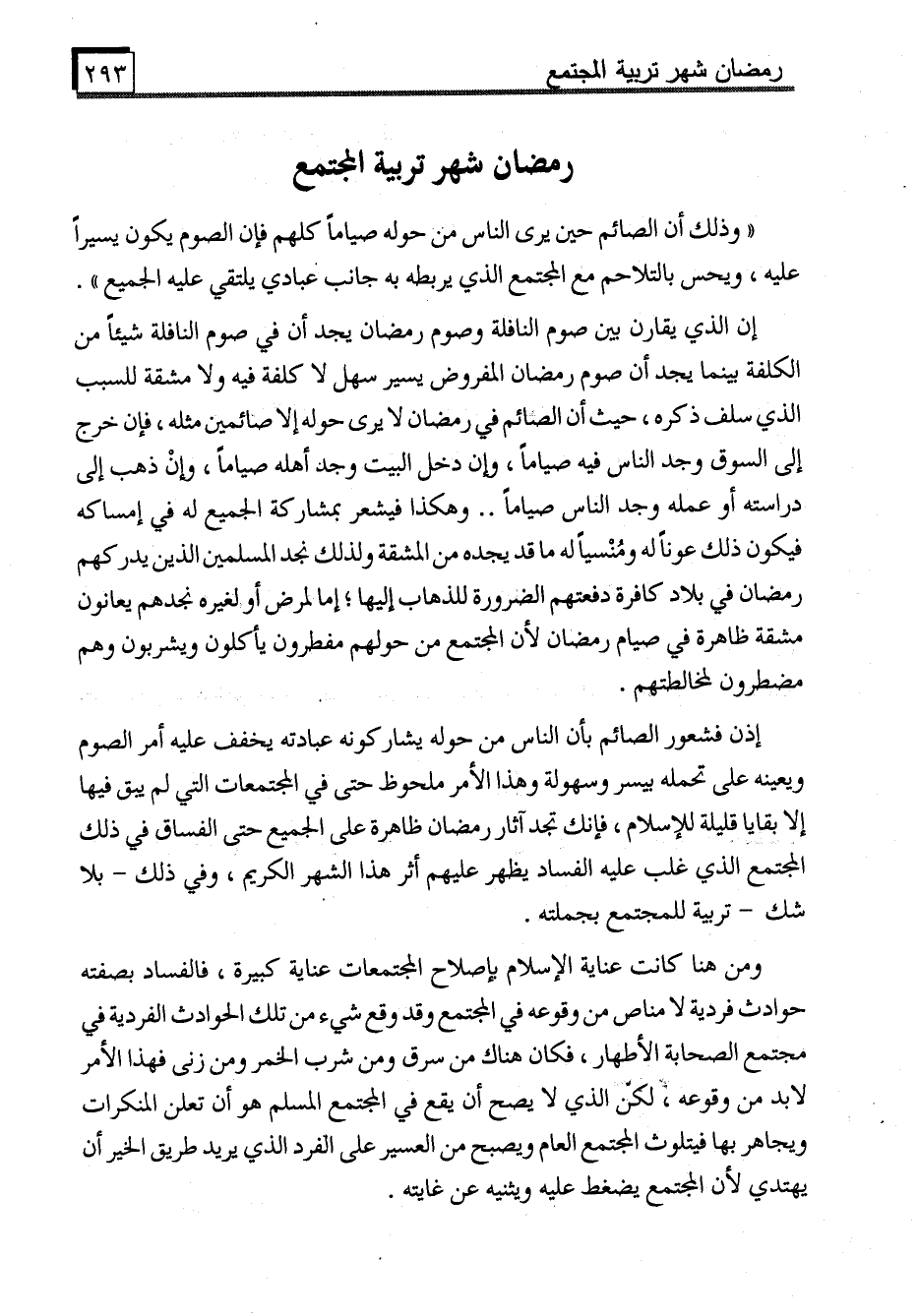 "وذلك أن الصائم حين يرى الناس من حوله صياماً كلهم فإن الصوم يكون يسيراً عليه، ويحس بالتلاحم مع المجتمع الذي يربطه به جانب عبادي يلتقي عليه الجميع".