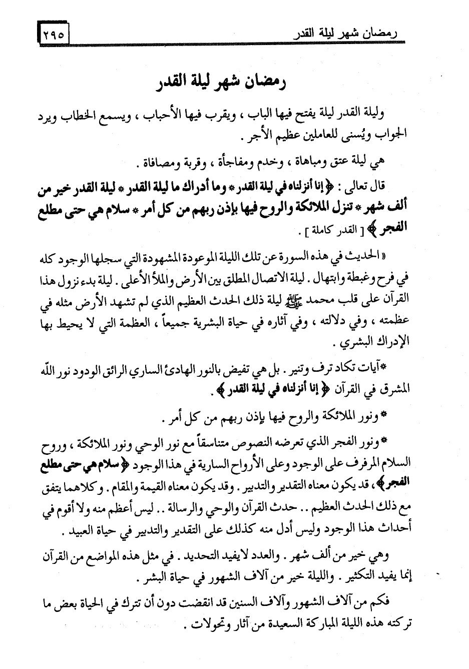 * ونور الفجر الذي تعرضه النصوص متناسقاً مع نور الوحي ونور الملائكة، وروح السلام المرفرف على الوجود وعلى الأرواح السارية في هذا الوجود (سلام هي حتى مطلع الفجر) ، قد يكون معناه التقدير والتدبير. وقد يكون معناه القيمة والمقام. وكلاهما يتفق مع ذلك الحدث العظيم.. حدث القرآن والوحي والرسالة.. ليس أعظم منه ولا أقوم في أحداث هذا الوجود وليس أدل منه كذلك على التقدير والتدبير في حياة العبيد.